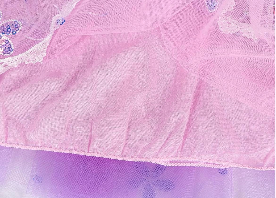 Красивое платье, верх из розовых пайеток, отделан кружевом и золотыми вставками. Платье в розовых и фиолетовых тонах. Низ платья выполнен из фатина по образцу Рапунцель из сказки «Заплатани», отделан ажурным кружевом и золотой атласной лентой, состоящей из 2 слоев атласной подкладки и 3 слоев фатина. Она прекрасно плавает во время танца. У платья очаровательные короткие рукава.