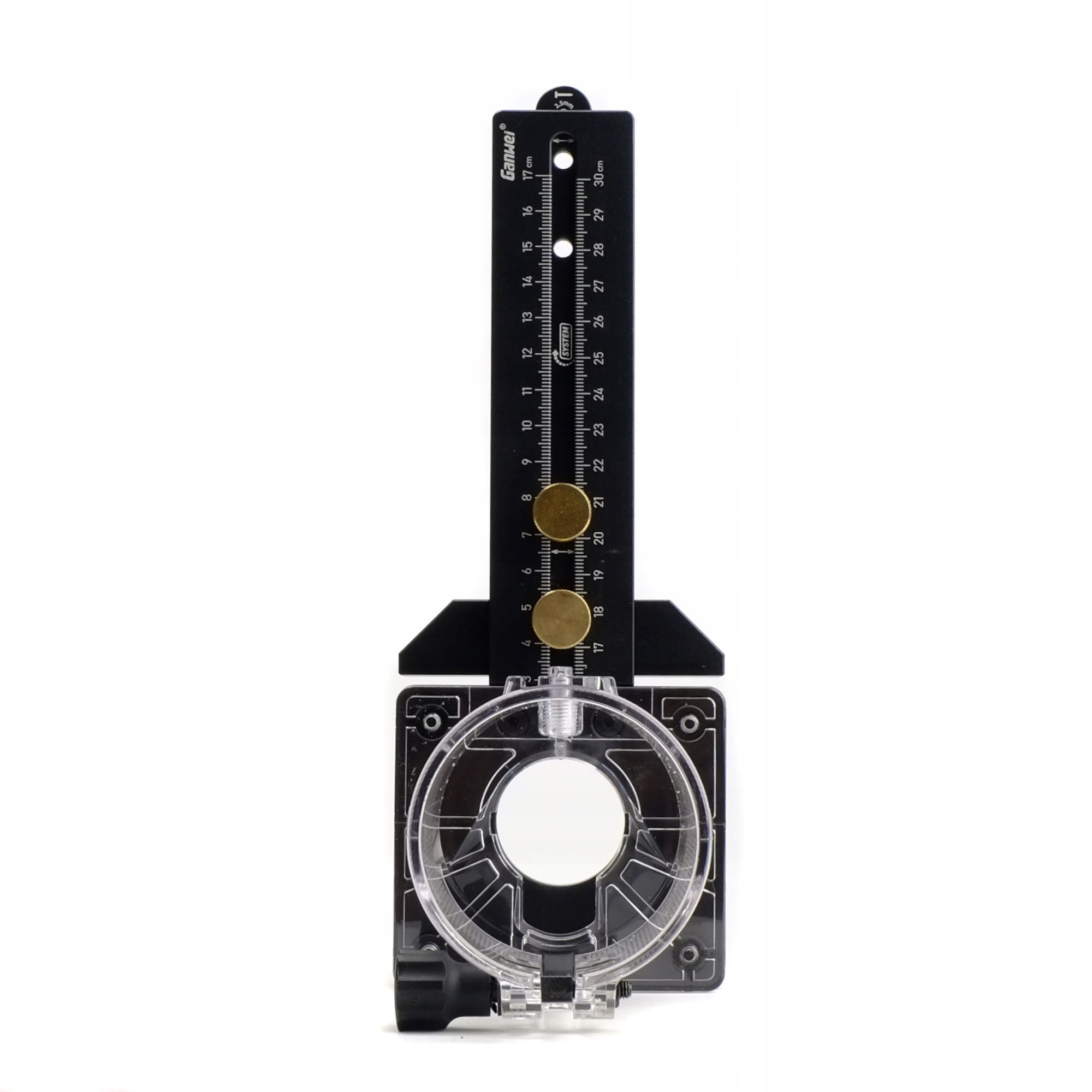 Ширка циркуля скользит в основании насадки и может поворачиваться на 180 градусов в зависимости от диаметра круга. Полоса имеет 3 резьбовых отверстия, в которые можно ввинтить стопорный винт.