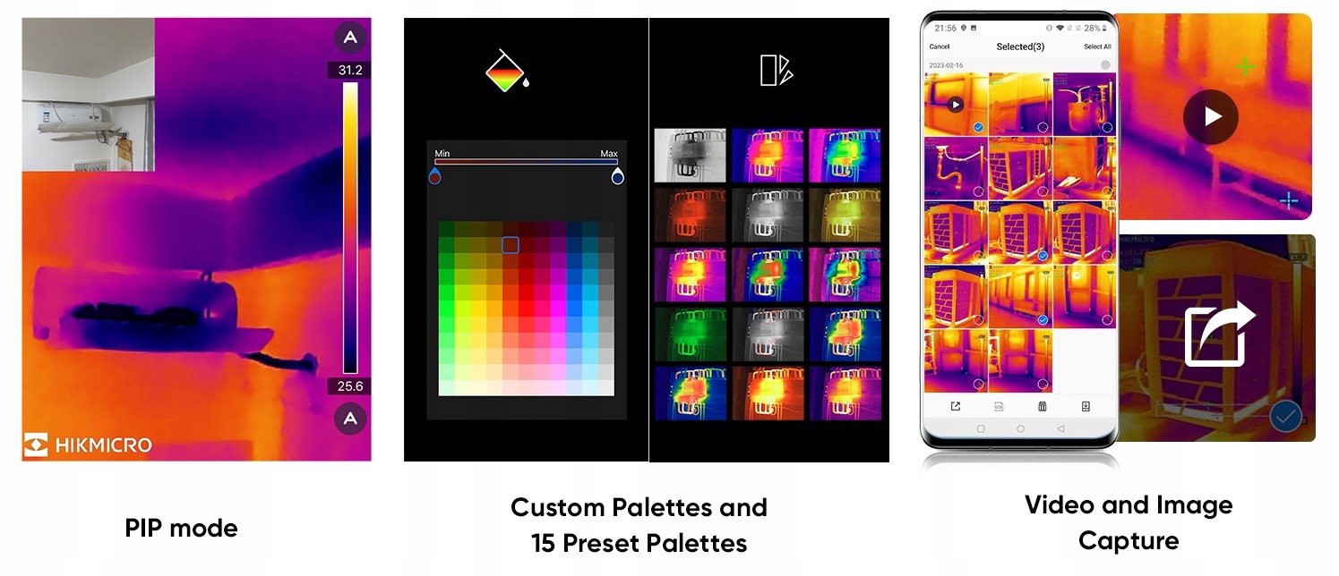 HIKMICRO Mini2 V2, оснащенный режимом PIP, возможностью выбора из 15 предустановленных и пользовательских цветовых палитр, а также функциями записи видео и фото, значительно повышает производительность измерения изображений и температуры