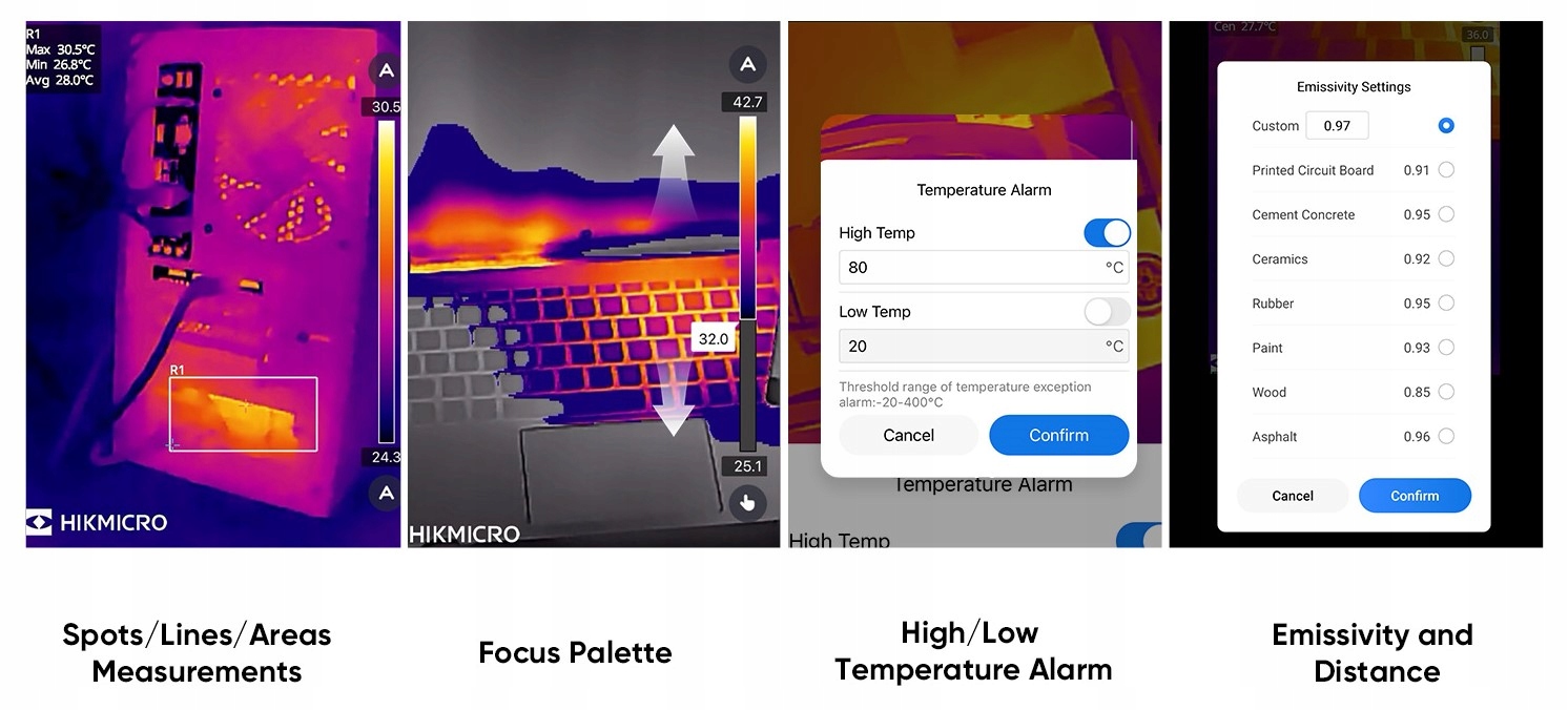 Наличие расширенных настроек, таких как коэффициент излучения, расстояние и дальность действия тепловизионной камеры, позволяет точно получать высококачественные тепловизионные изображения и точные измерения температуры различных поверхностей.