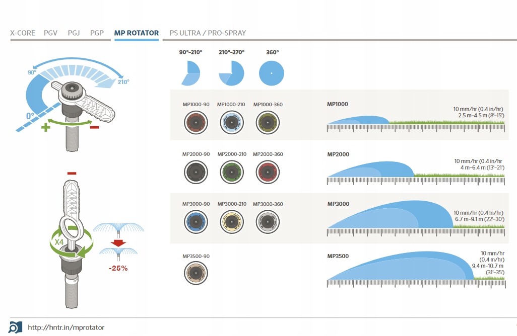 MP Rotator расходует меньше воды и в то же время — благодаря ветроустойчивой струе — обеспечивает более равномерный полив поверхности, чем традиционная насадка. Работа MP Rotator не сопровождается образованием тумана, образующегося под высоким давлением, однако многоструйный поток обеспечивает больший охват и меньшие дозы, чем одиночный поток из турбинного спринклера. Кроме того, он более надежен и требует меньших затрат на установку и эксплуатацию, чем турбинный спринклер. MP Rotator, как одиночная насадка, позволяет регулировать радиус распыления. Внутренний сетчатый фильтр обеспечивает дополнительную защиту от засорения насадки. Дополнительным преимуществом является возможность установки всех моделей (MP1000, MP2000, MP3000, MP3500 и MPCorner) в одной зоне, что дает большую гибкость при проектировании системы орошения.