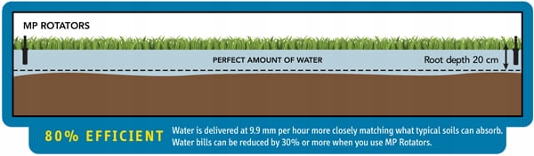 Стандартная линейка форсунок MP Rotator подает воду со скоростью осаждения 10 мм/час, а модель MP800 имеет скорость осаждения 20 мм/час. Любой вариант позволит избежать стока воды, сэкономит воду и защитит почву от эрозии