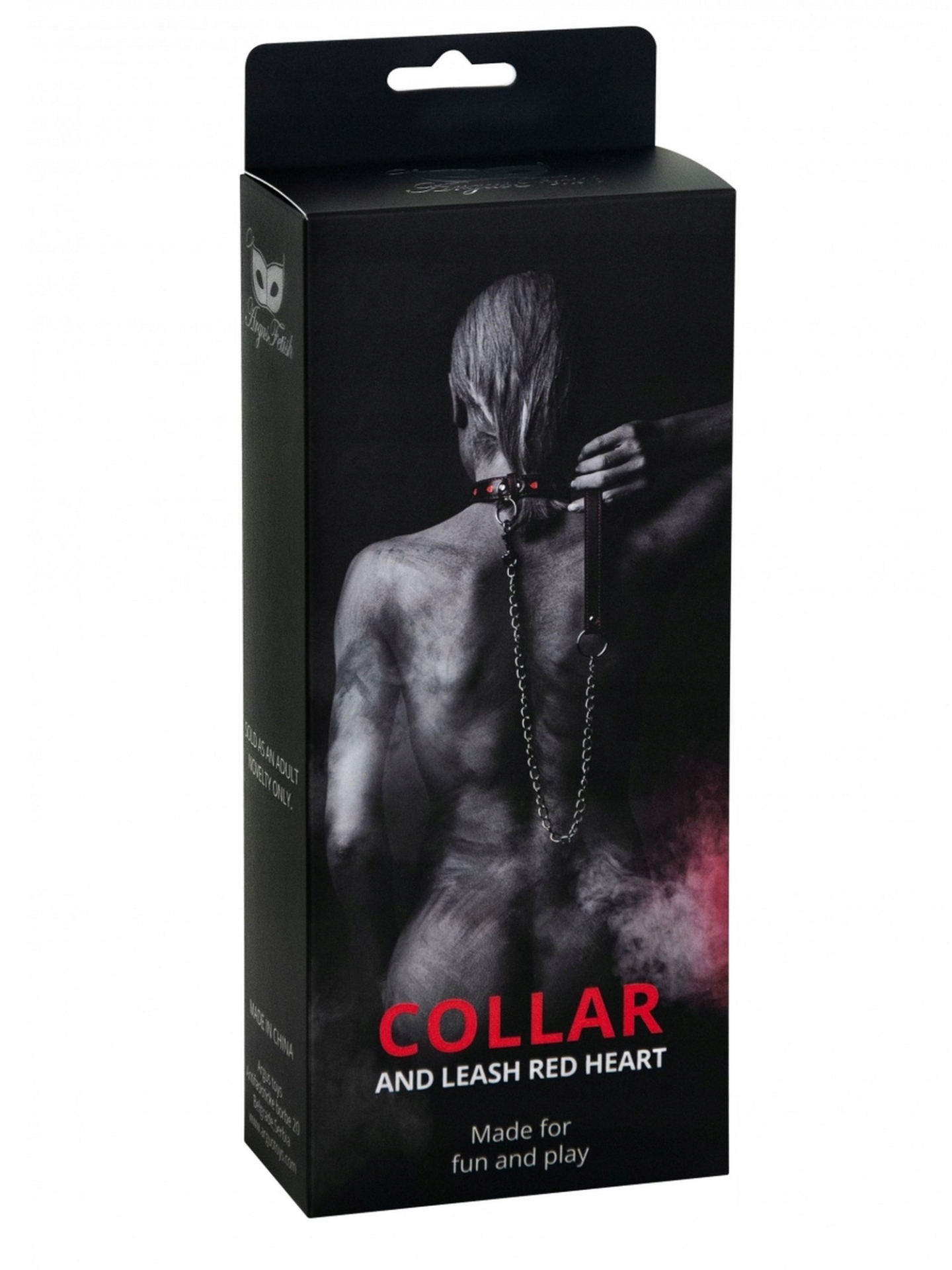 Воротник украшен красными сердечками, застегивается на металлическую пряжку, с помощью которой также можно регулировать ширину