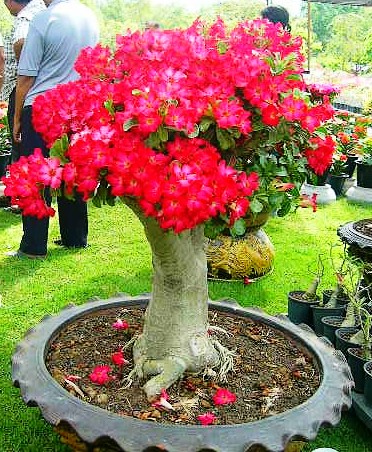 Своим названием «Роза пустыни» растение обязано своим красивым крупным пятилепестковым цветкам, которые появляются весной. Цветки могут быть красными, фиолетовыми, розовыми или белыми. Адениум дает укороченные побеги и толстый бутылкообразный ствол, очень напоминающий сформировавшееся растение бонсай. Каждый адениум создает свою уникальную форму. Нет двух одинаковых деревьев. Adenium obesum встречается в полузасушливых регионах Африки, на Аравийском полуострове и в юго-западной Азии.