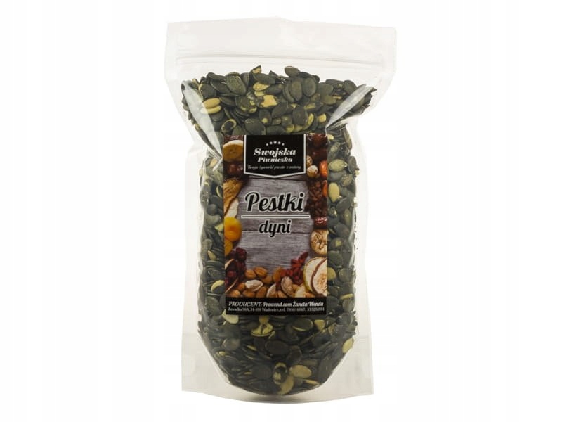 Семена тыквы, темно-зеленые - Вкусные семена тыквы из польских культур. Они подходят как дополнение к домашней выпечке, салатам и салатам. Их можно поджарить и есть как закуску самостоятельно. Семена тыквы содержат ценное масло, которое можно отжимать и добавлять в блюда, а выжимки (обезжиренные) можно измельчать в муку из семян тыквы, которую можно использовать для загущения супов или соусов.
