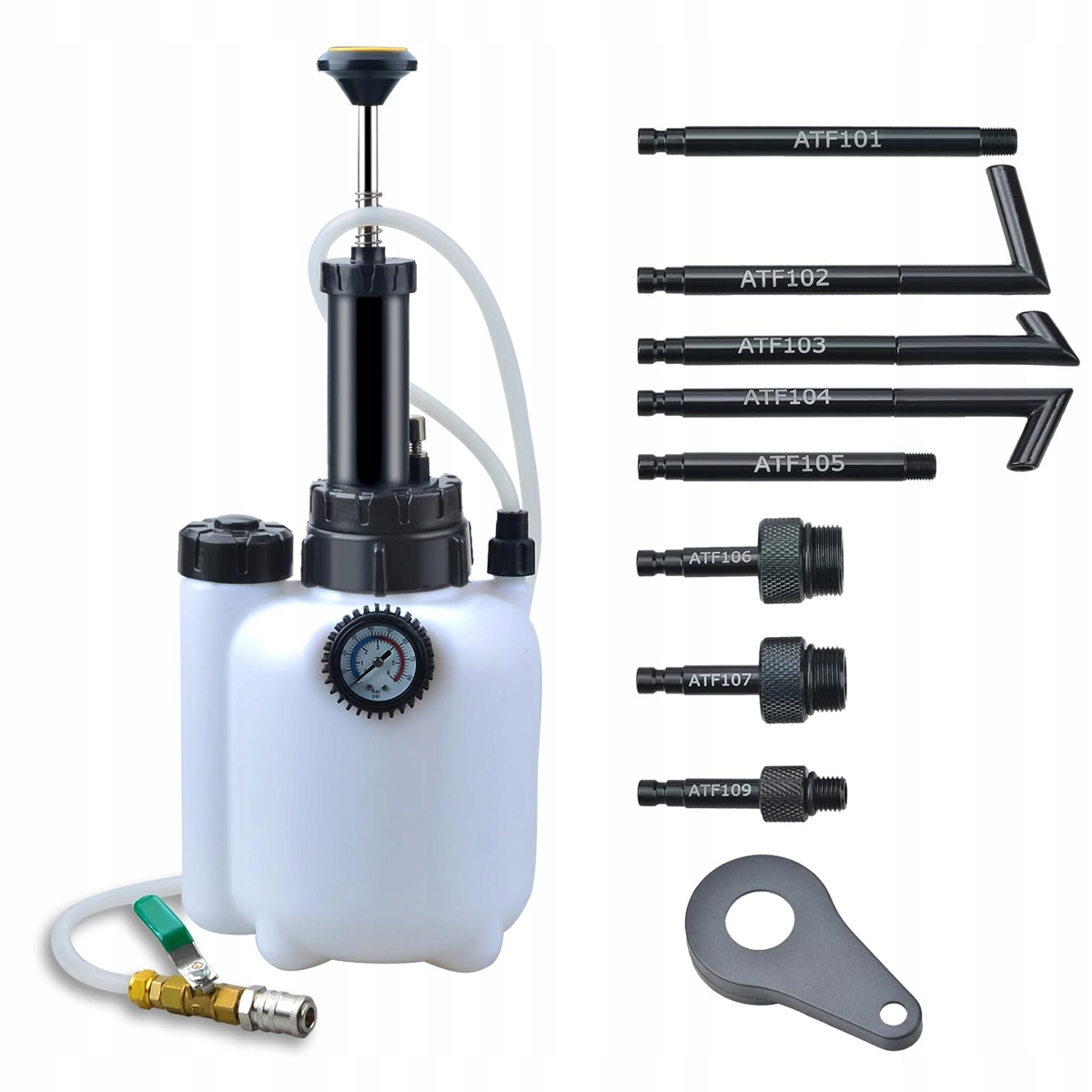 🌈🌈🌈 КОМПЛЕКТ ПЕРЕХОДНИКОВ: В комплект для прокачки жидкости коробки передач входит 3-литровый бачок с крышкой, манометр, крышка заливной горловины, шланг и 8 переходников для жидкости коробки передач.