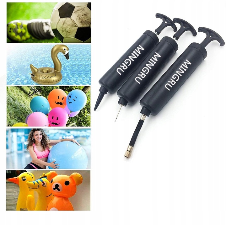 В комплект входят 4 металлические иглы, 2 пластиковые конические насадки и 1 гибкий резиновый шланг, что позволяет надувать различные типы и размеры спортивных мячей и других надувных изделий.