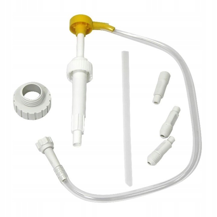 Насос сменой масла универсального шестерня -A для изменения масла трансмиссии на высоте подвесного или стационарного двигателя на лодках и яхтах. Обмотка насоса на масляной бутылке используется для вставки шестерни в двигатель. Кончик труб заполняется резьбой, это решение обеспечивает полную плотность во время замены. Включены трубки, уменьшение нити до галлонных цилиндров и трех сменных адаптеров с различными потоками (M8, M10, M 3/8 ''),