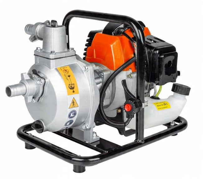 Насос оснащен эффективным двухтактным двигателем внутреннего сгорания, работающим на топливно-масляной смеси с октановым числом 95. Корпус двигателя и насоса изготовлен из чрезвычайно легкого и прочного алюминиевого сплава, устойчивого не только к механическим повреждениям, но и к износу. Крышки двигателя изготовлены из высококачественного пластика. Насосный элемент в насосе отлит из чугуна, что делает его устойчивым к большим нагрузкам и длительному использованию. Все компоненты были смонтированы на специально адаптированной раме из стальных труб, покрытых защитным черным покрытием. В основание вкручены резиновые ножки, которые предотвращают перемещение всего агрегата и передачу вибрации на землю. Бесступенчатое регулирование позволяет настроить производительность насоса под индивидуальные нужды, обеспечивая эффективную и экономичную работу.