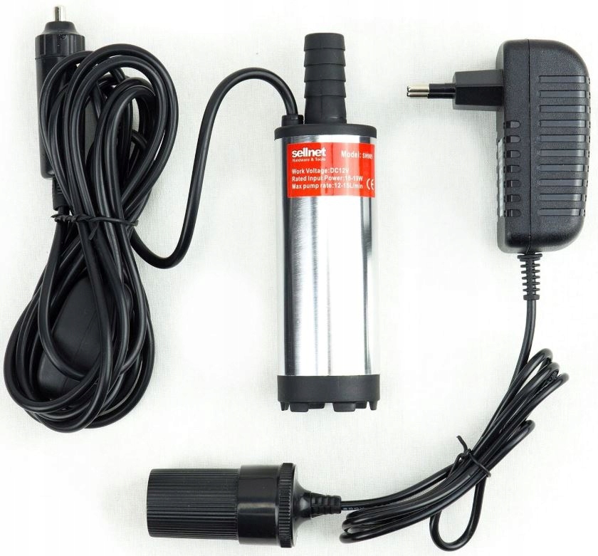 Универсальный погружной насос для перекачивания жидкостей, с питанием от прикуривателя 12В розетку, либо после подключения входящего в комплект блока питания к розетке 230В.