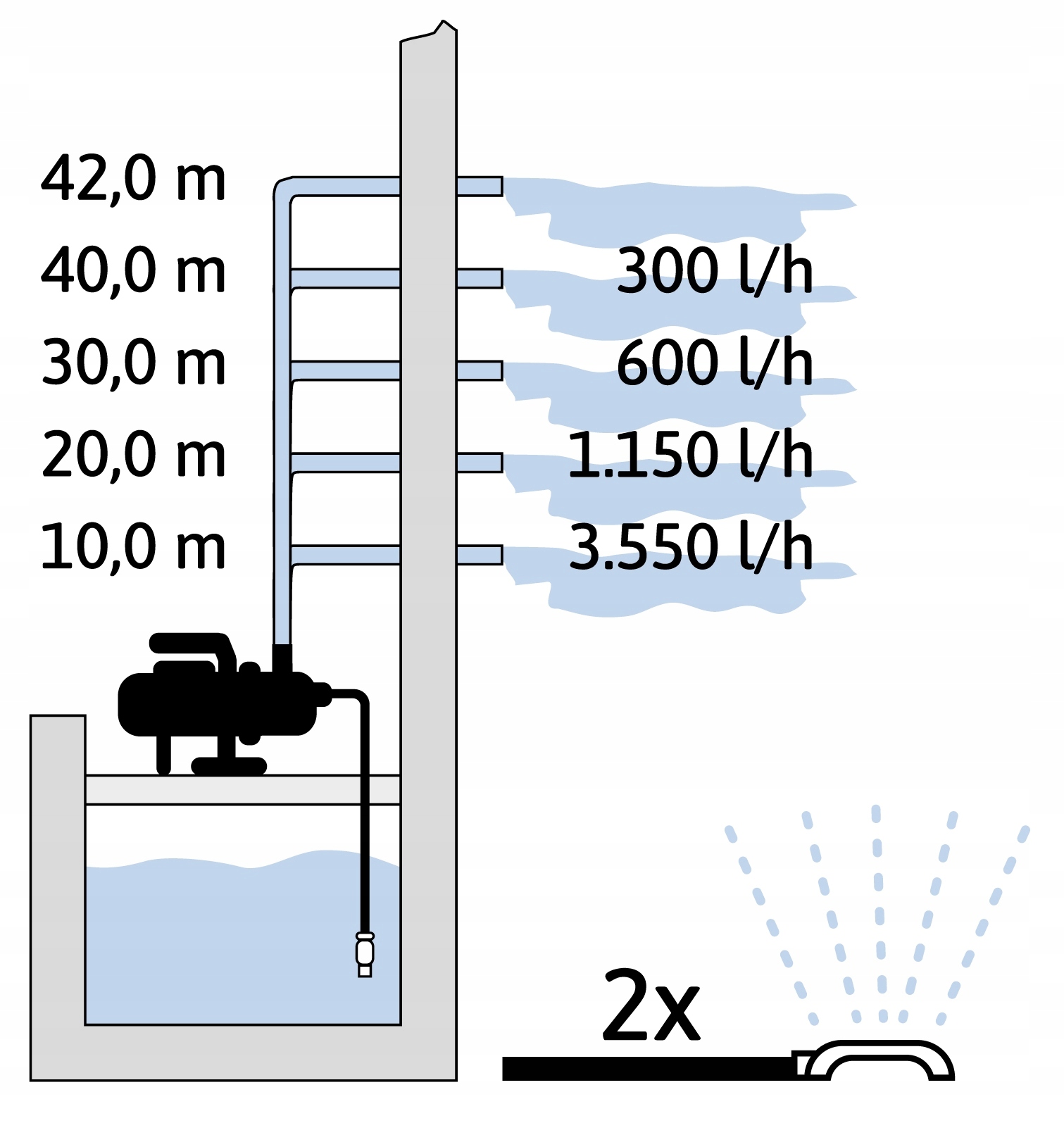 Насос оснащен защитой от тепловой перегрузки, струйной гидравликой и блоком питания с кнопками включения/выключения, надежно защищенным от атмосферных воздействий. условиях и является продуктом, отвечающим самым высоким техническим стандартам садовых насосов.