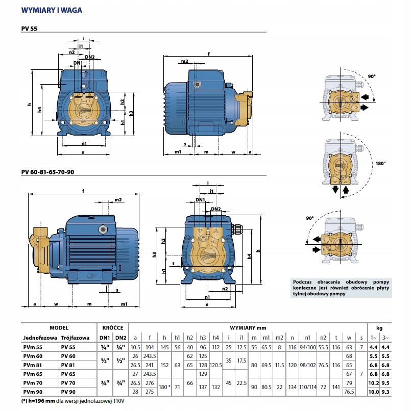 - Возможно изменение положения корпуса насоса относительно двигателя на 90', 180 ' или 270'