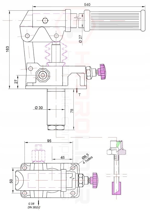 Из насоса выходит один масляный патрубок (на фото красный колпачок), позволяющий подключить привод одностороннего действия. Насос прекрасно работает со всеми односторонними приводами Hydrolider из нашего предложения.