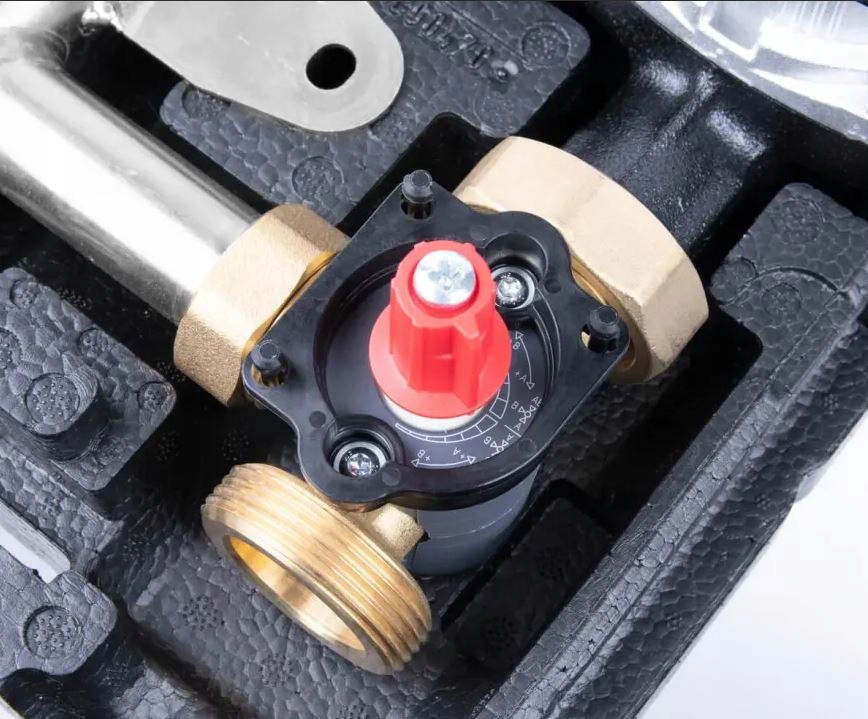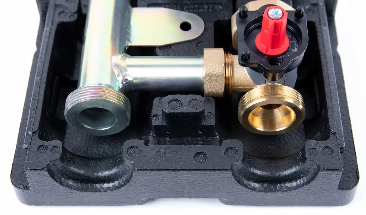 Оснащен необходимыми компонентами: термометрами, обратным клапаном, запорными кранами на подаче и обратке, запорными запорный клапан перед насосом и теплоизоляция.