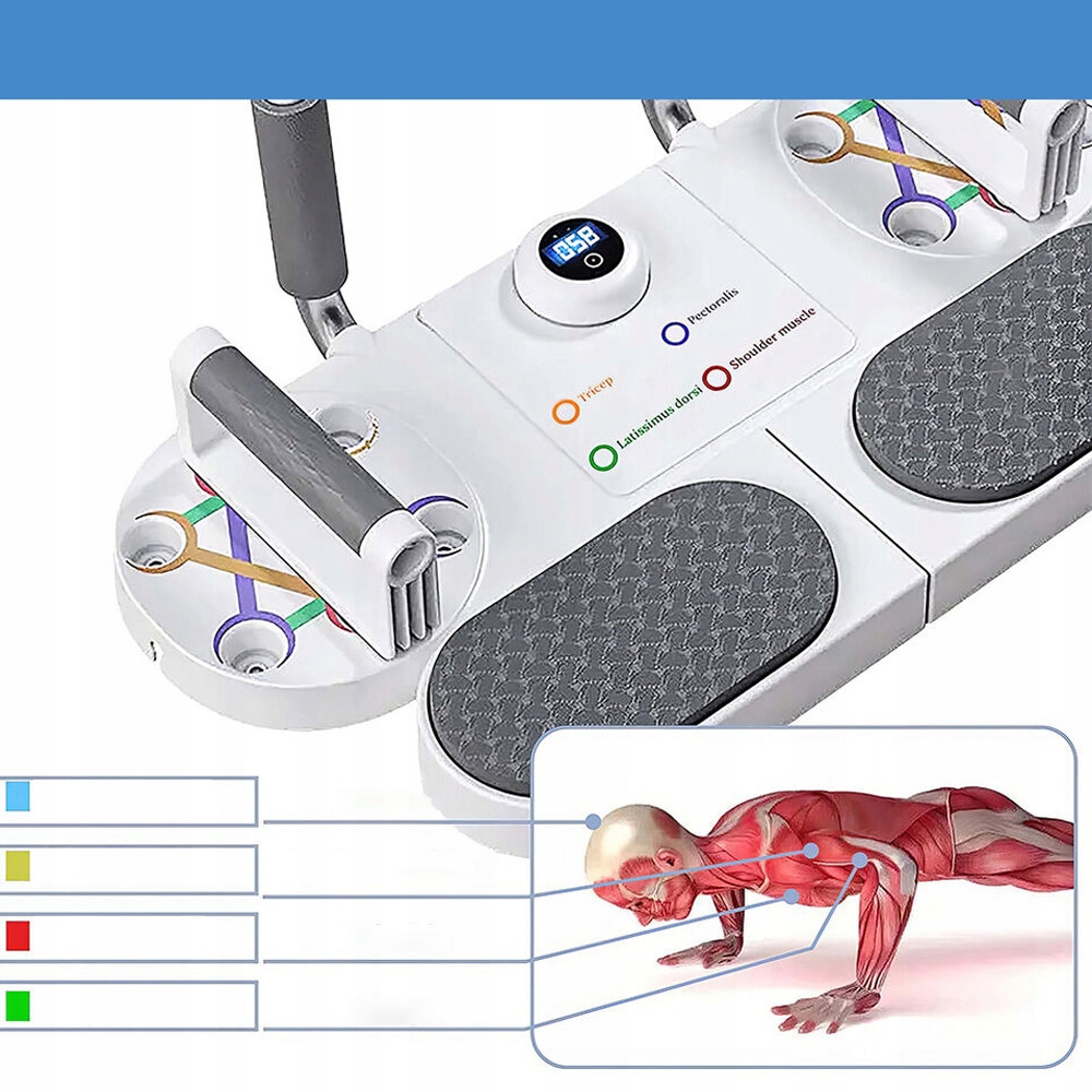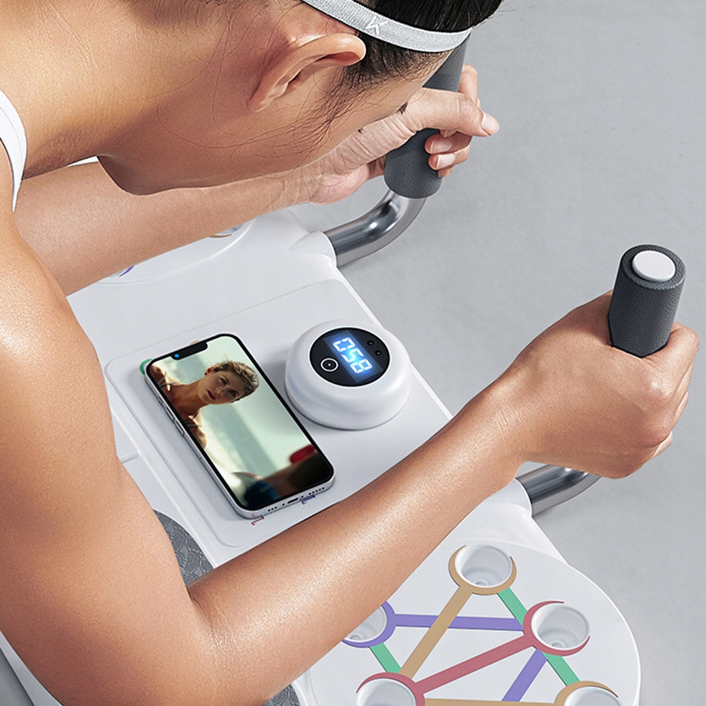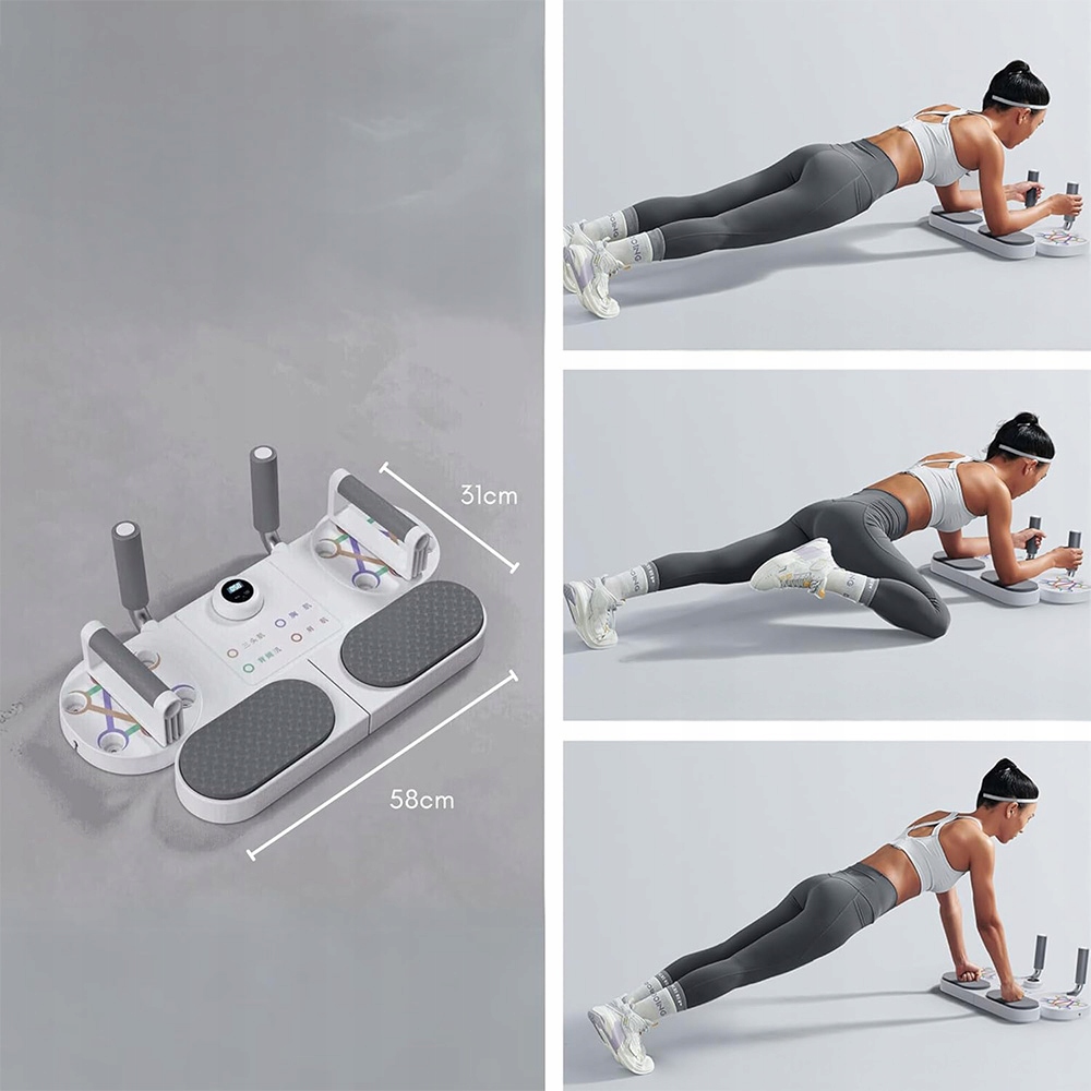 содержит насосную доску со многими позициями для использования различных групп мышц, система планок с ручками и удерживающими лентами для дополнительного сопротивления и разнообразия тренировок. Плоские опоры/насосы/натяжительные веревки. Экран высокого разрешения, интеллектуальный подсчет.