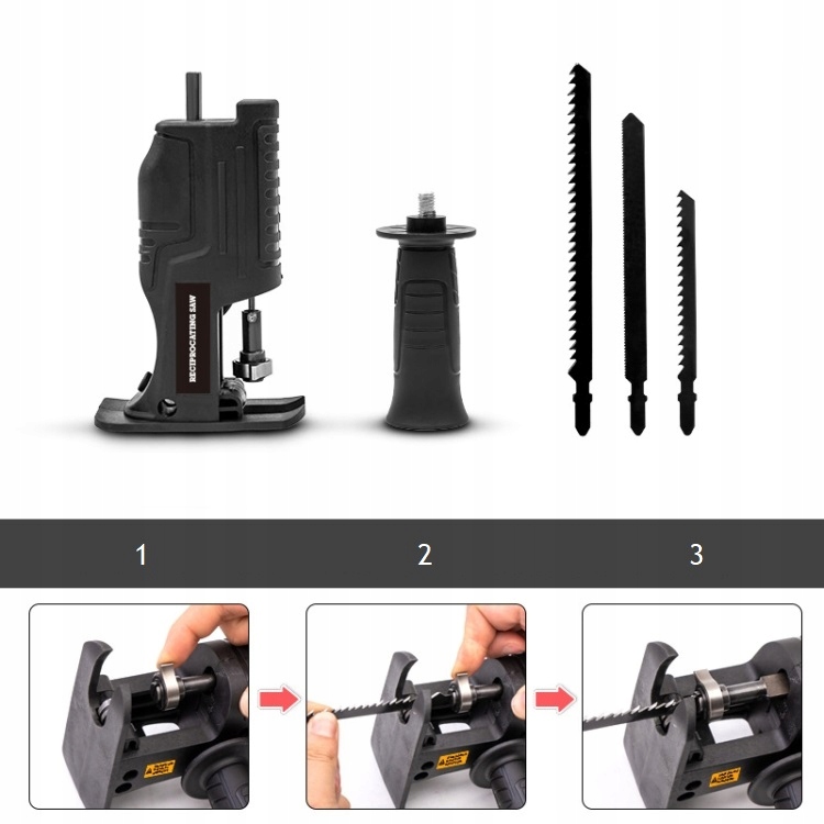 Предлагаем Вам насадку для дрели или шуруповерта, трансформирующуюся в сабельную пилу, это отличный инструмент для быстрой резки дома и на природе. Пила «лисий хвост», оснащенная подходящим полотном, заменит ручную пилу или другие электрические пилы. Он может обрабатывать дерево, металл, пластик и т. д.