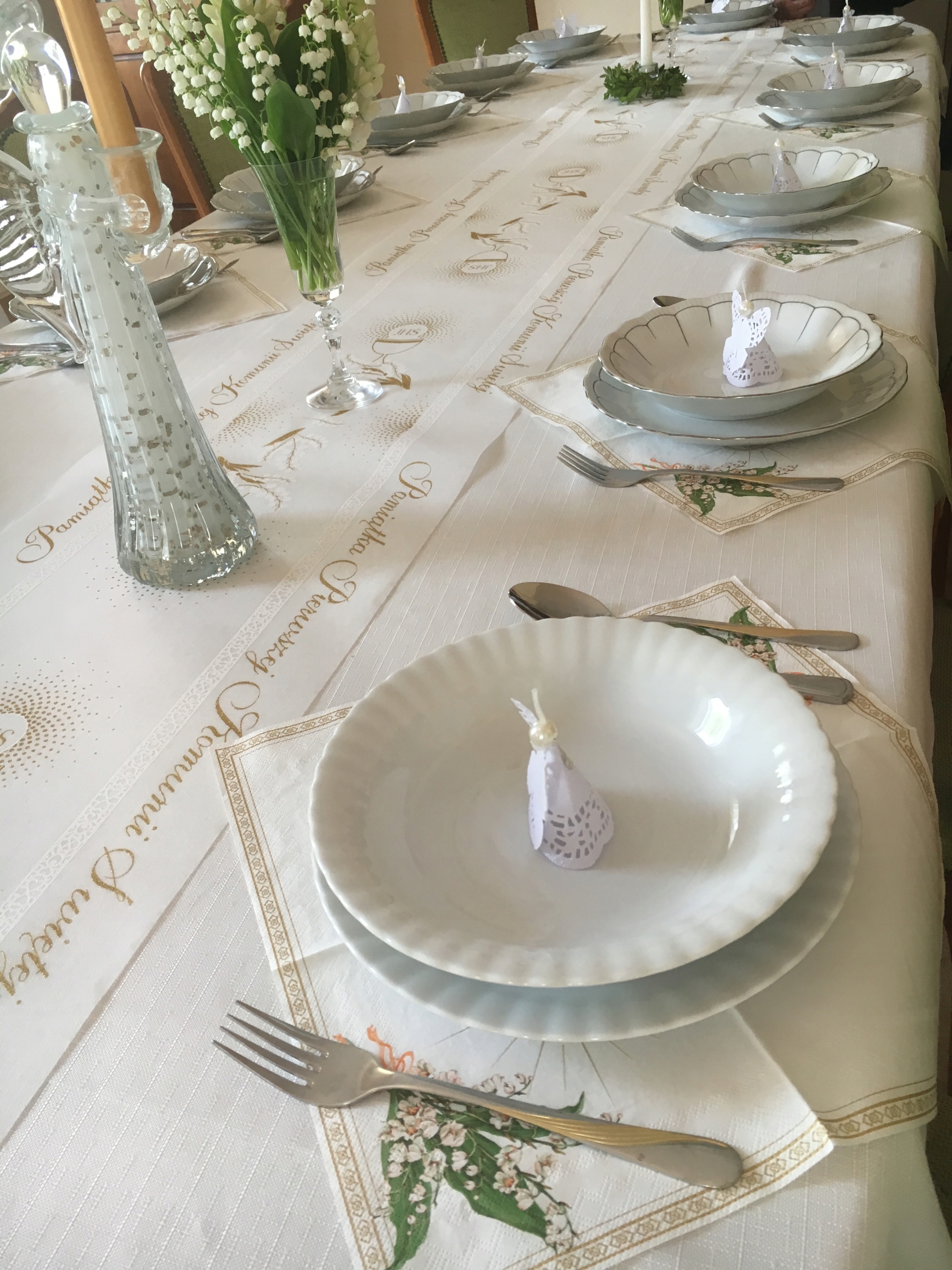 ХИТ сезона Первого Причастия — эта белая мини-скатерть с золотым принтом и дополнительным рельефным узором.