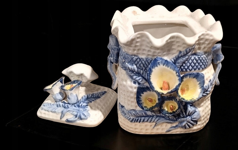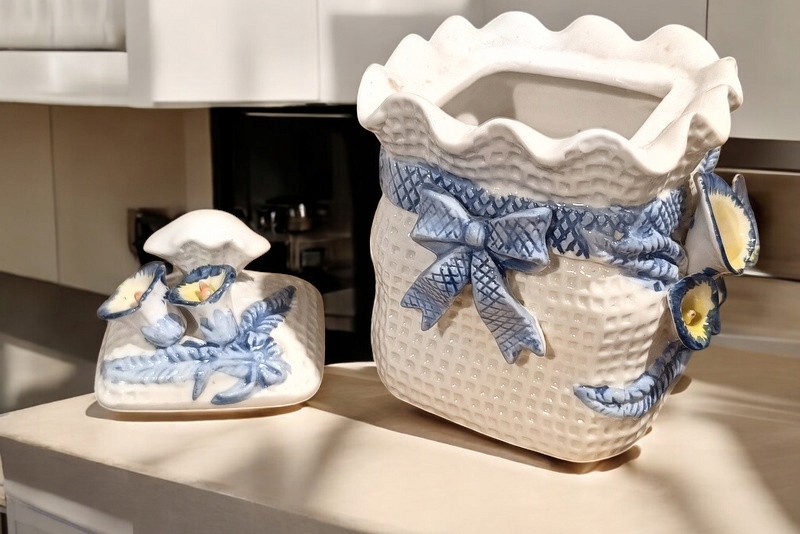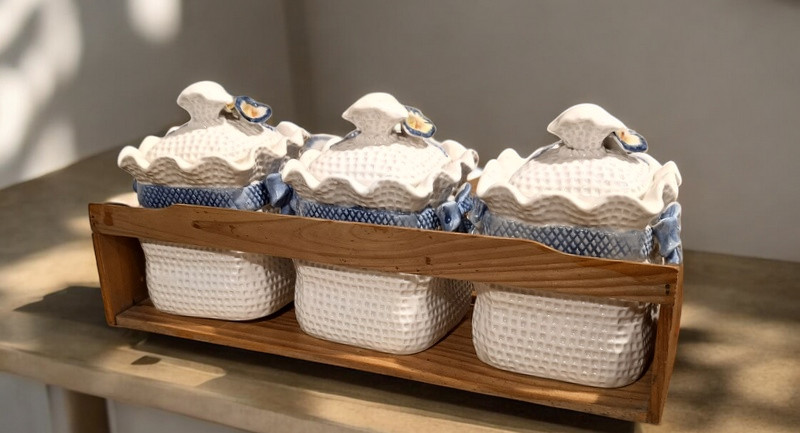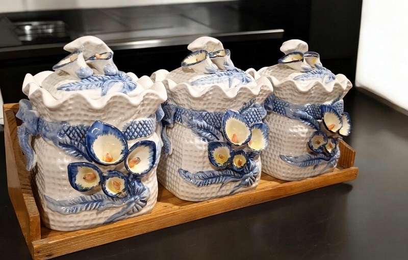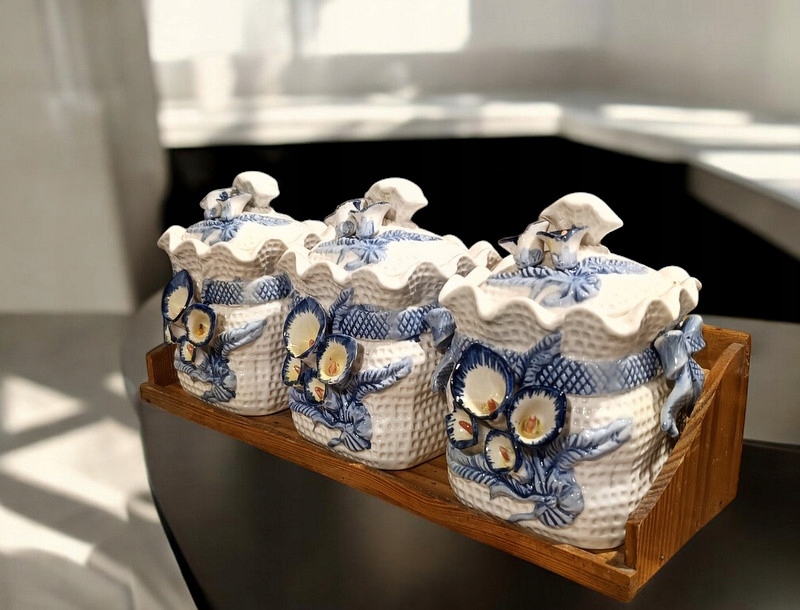 Керамические контейнеры для кухни на деревянной полке. Набор состоит из трех контейнеров с крышками, украшенных бантиками и цветами в желтых и синих тонах. Состояние очень хорошее-без повреждений. Комплект восхищает очаровательными цветами и изысканной формой. Прекрасный набор станет, например, отличным подарком, практичным и декоративным элементом стильного интерьера, а украшение кухни станет стильным.
