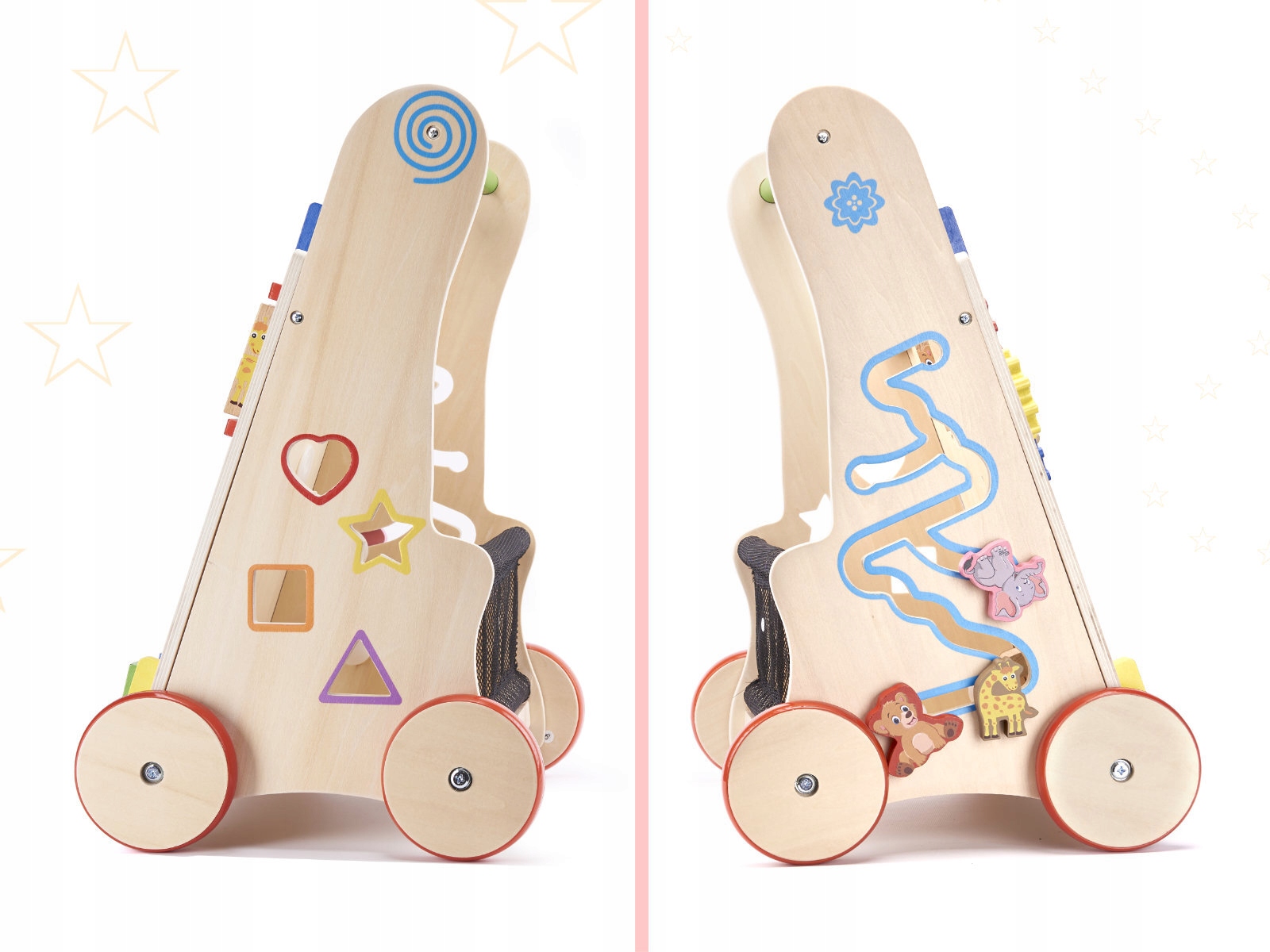 Многофункциональная деревянная толкатель для детей облегчит обучение ходьбе. На передней панели расположено множество игрушек: шестеренки, пазл с картинками, движущиеся кубики, тарелки, телефон и часы. По бокам расположен сортер и лабиринт. Размеры: 51х32,5х31см.