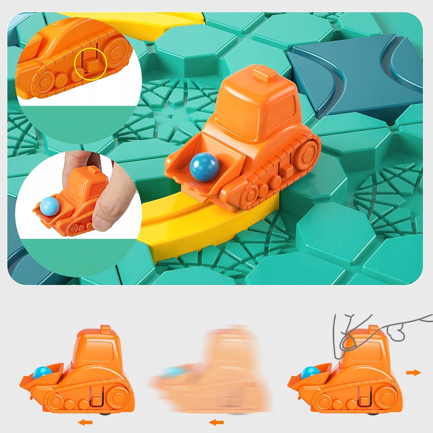 Чтобы запустить экскаватор, достаточно потянуть его назад, чтобы завести механизм. Затем, нажав квадратную вкладку, блокируем механизм и ставим экскаватор в начало пути. Отпустив механизм, экскаватор устремляется вперед.