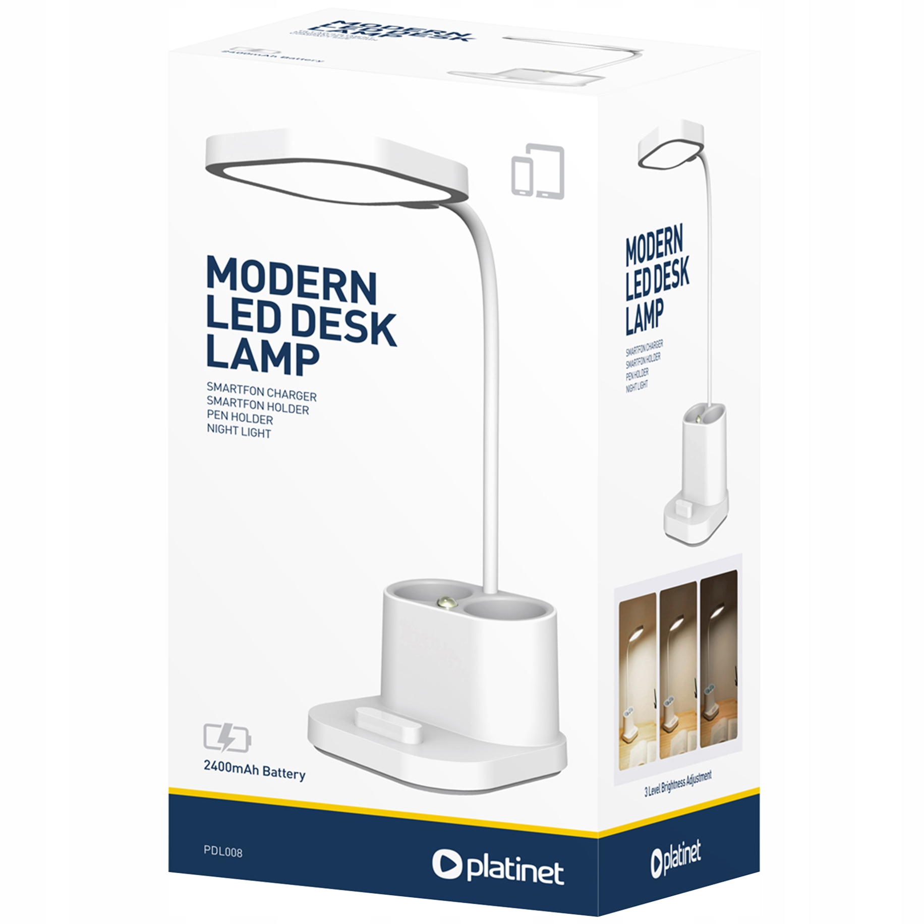 Светильник Platinet имеет трехступенчатую регулировку света, что позволяет обеспечить мягкую подсветку и освещение рабочего места. Кроме того, в основании имеется встроенная светодиодная лампа, которую можно использовать как ночник или декоративную лампу. Лампа регулируется по интенсивности и направлению света. Благодаря светодиодной технологии лампа очень энергосберегающая, не нагревается и имеет высокую яркость. Дополнительной особенностью является встроенная функцияUSB-зарядного устройства. .