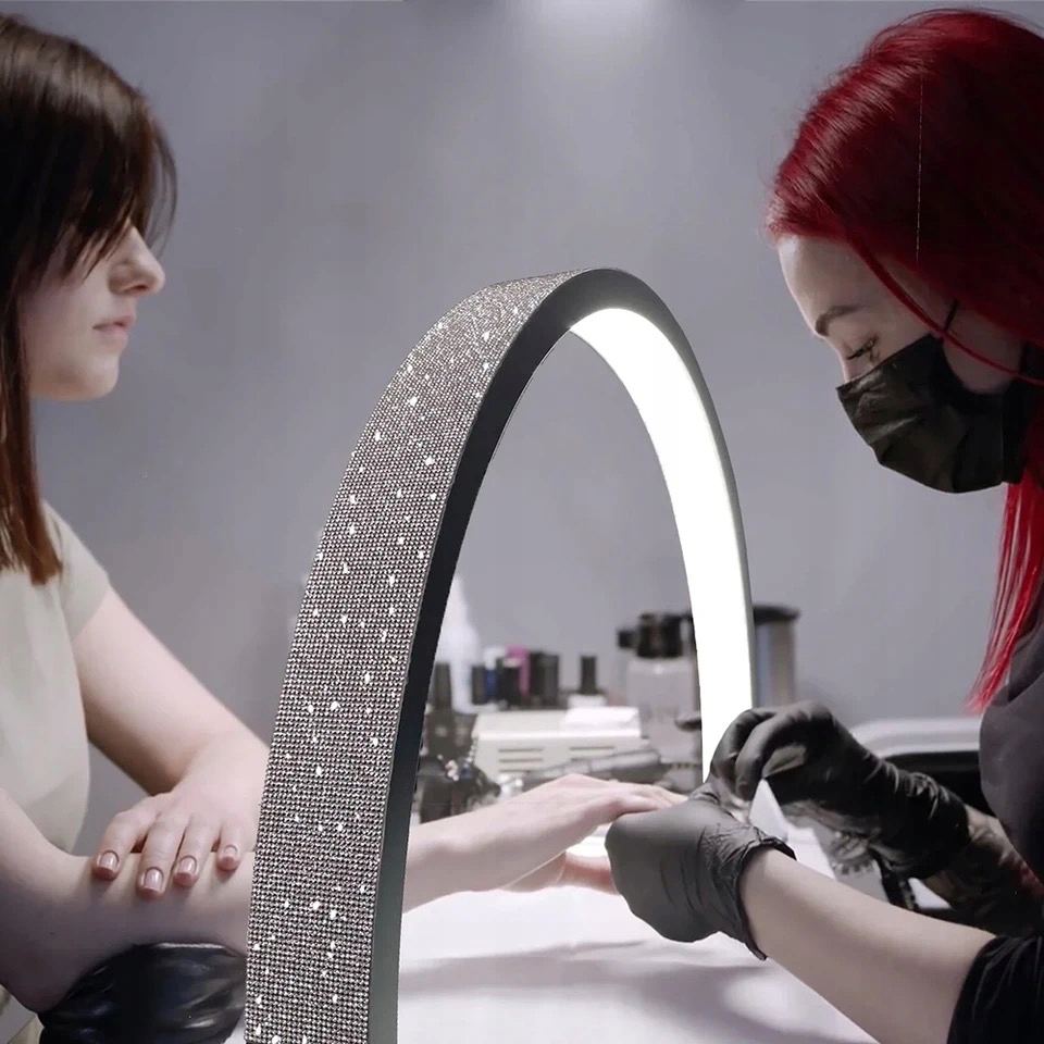 ✔️ Светильник оснащен уникальной дугообразной головкой, обеспечивающей отличное освещение во время процедур, требующих точности. Он будет использоваться во многих специализированных кабинетах, где Правильное освещение существенно влияет на качество предоставляемых услуг, таких как наращивание ресниц, укладка ногтей, татуировка, косметические процедуры и макияж. Он также будет хорошо работать при фотосъемке или записи видео благодаря устранению теней.