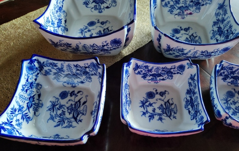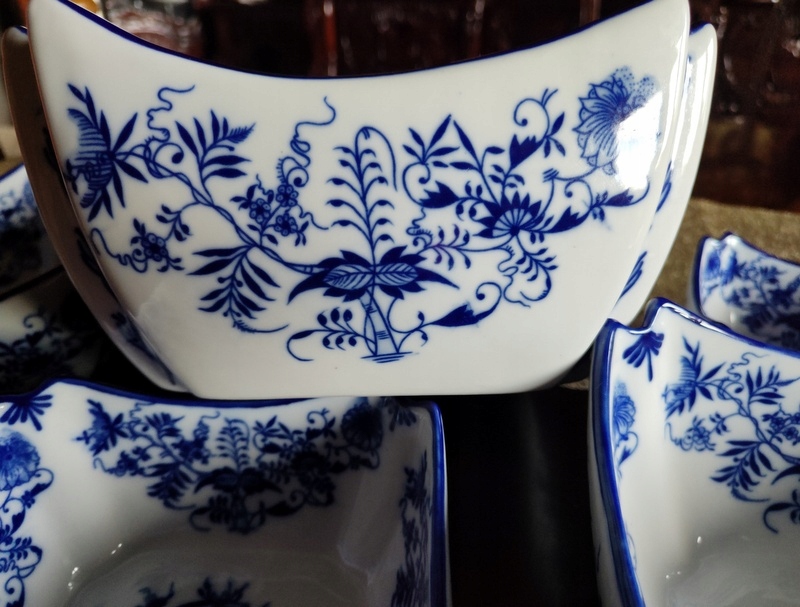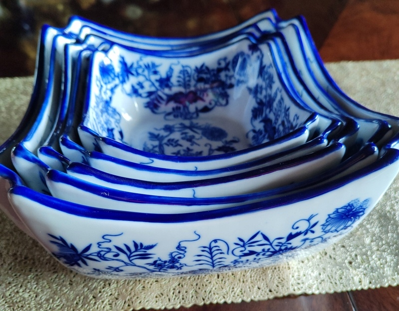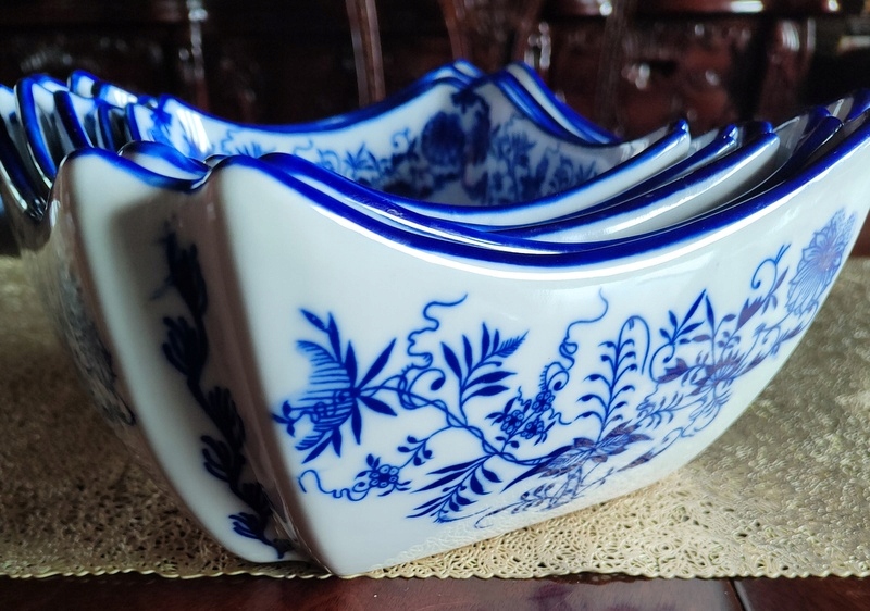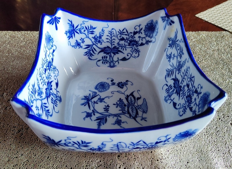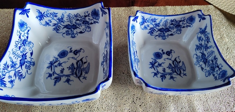 Стильные салатники, имитирующие старинный, антикварный фарфор. Товар новый-не использовался. Идеально подходит в качестве декоративного элемента, сосуда для сладостей, салатов, блюд и т. д. или как изысканный подарок к особому случаю. Дополнительными декоративными деталями изделия являются чудесные луковые узоры в синих тонах.
