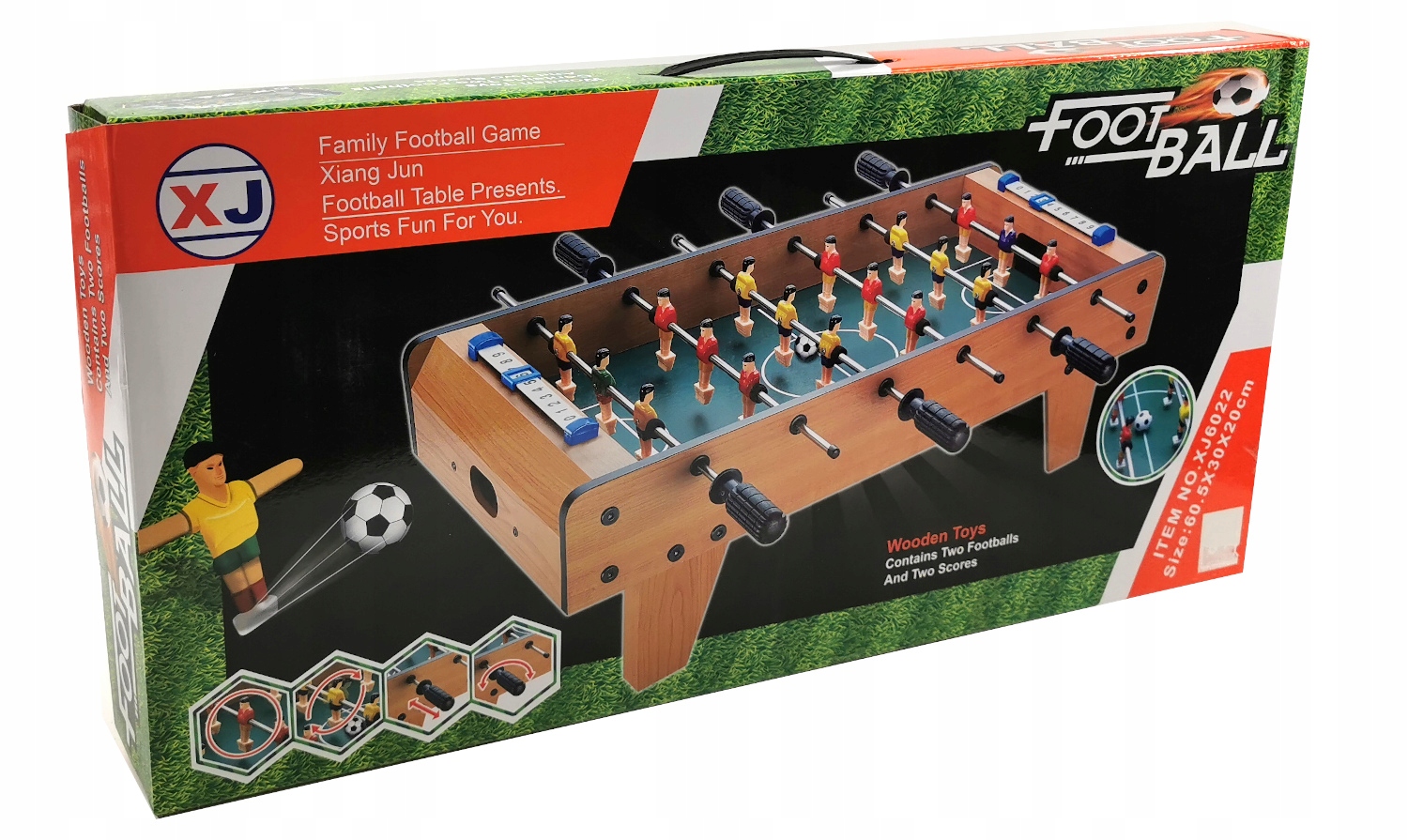 Стол изготовлен из твердой и прочной плиты МДФ. Столы для настольного футбола установлены на стальных направляющих, закрепленных удлинительным замком. На концах у них есть специальные ручки, которые делают игру устойчивой. Игроки изготовлены из прочного пластика.
