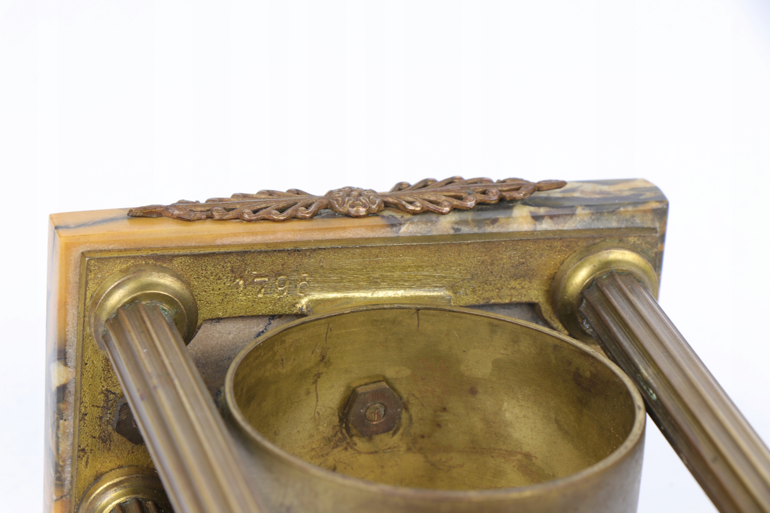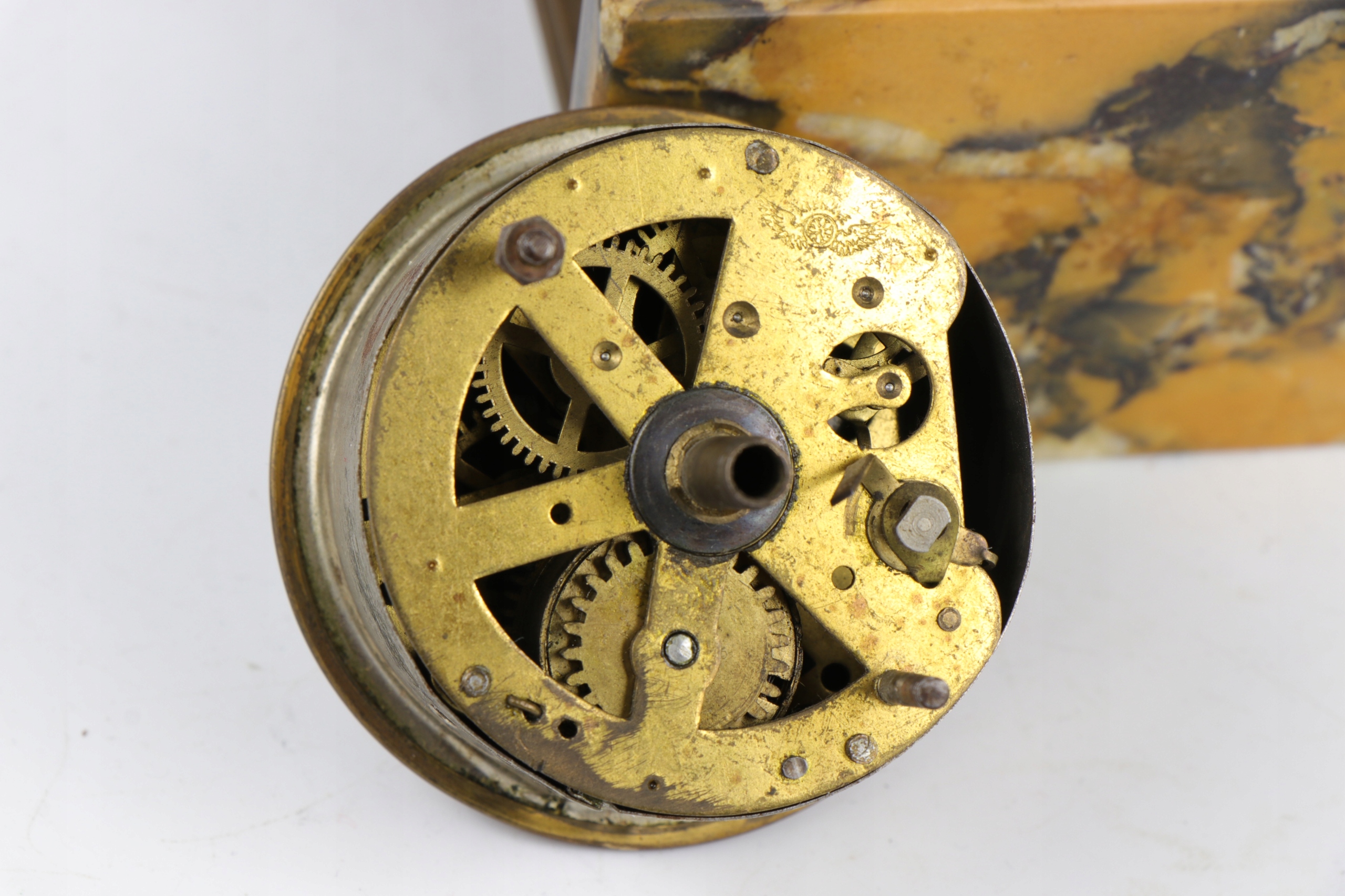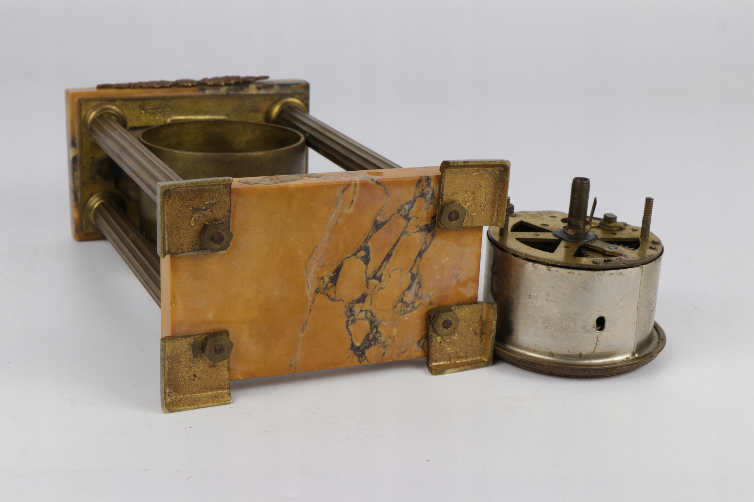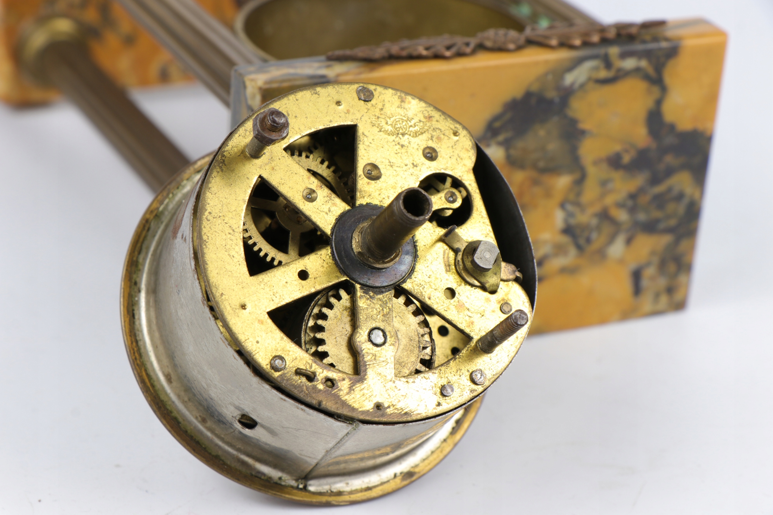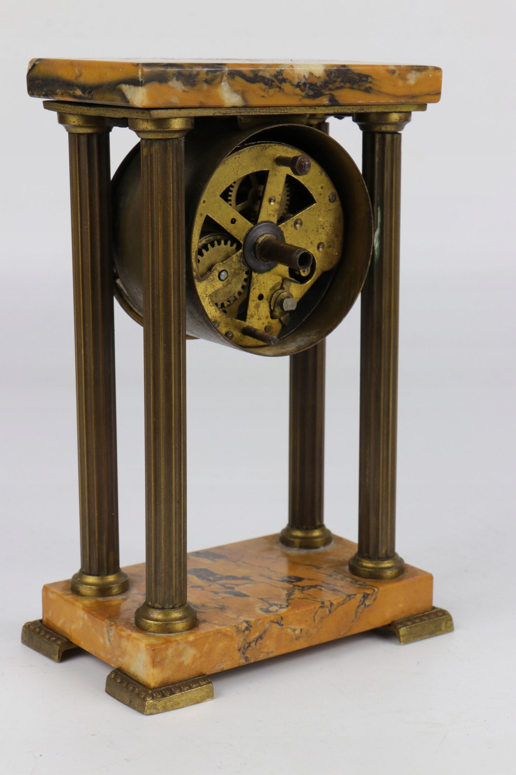 Интересный корпус и механизм каминных настольных часов в стиле Эмпи. Часы с четырьмя колоннами из бронзы или латуни, установленные на подставке из сиенского мрамора. Механизм Кинцле