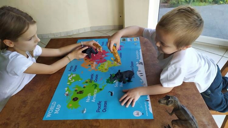 Образовательная карта мира с описанием континентов и океанов, а также самых популярных животных данного региона. инструмент, пробуждающий у детей географические увлечения и путешествия.