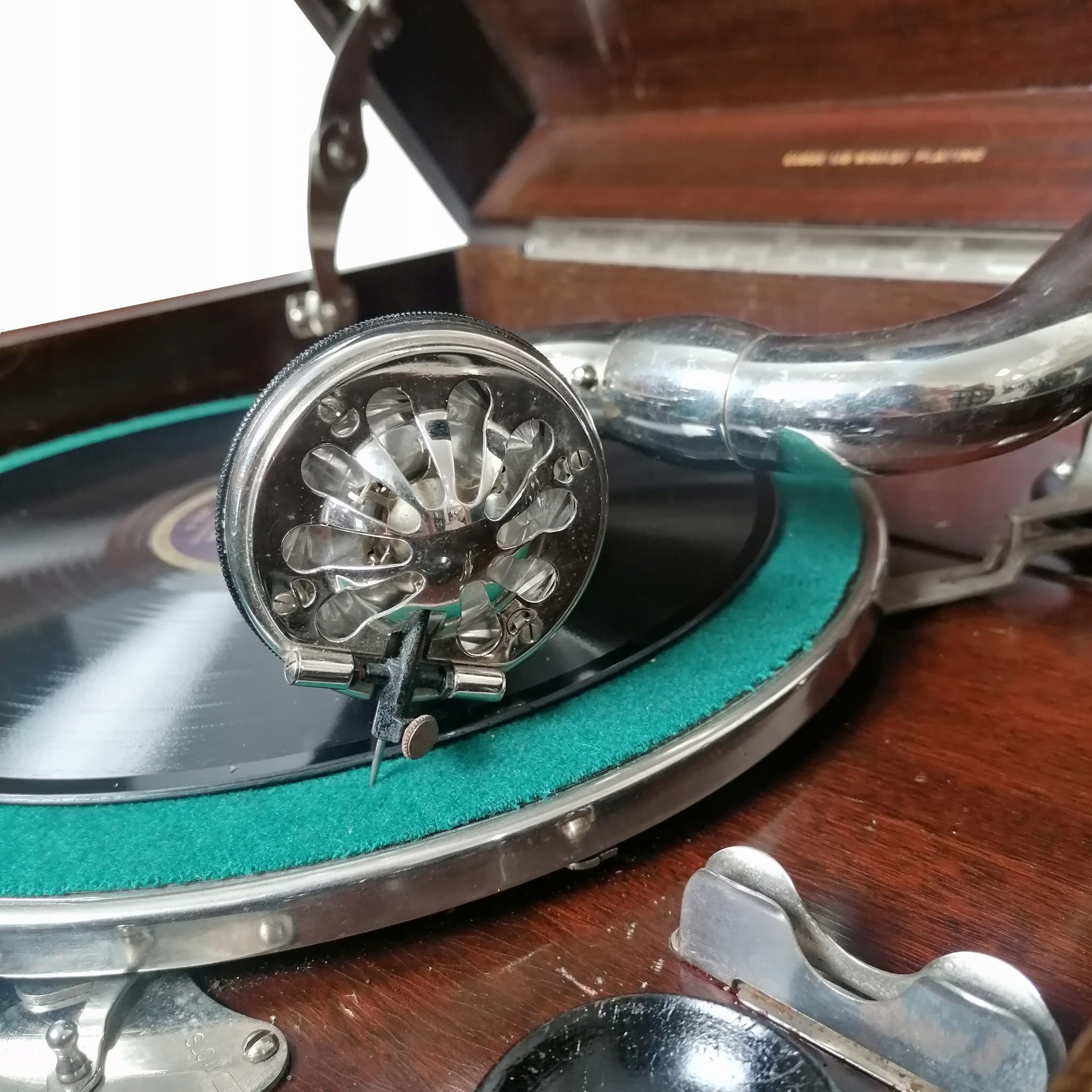 Проигрыватель работает с помощью рукоятки. Имеет механический привод - пружину с кривошипом и не требует подключения к электричеству. Воспроизводит пластинки шеллака со скоростью 78 об/мин. Чтобы воспроизвести песню, выполните: