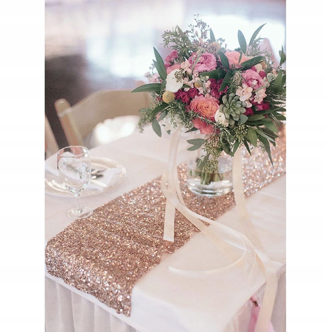 Вся дорожка стола выполнена из блесток, поэтому она красиво блестит на столе и все остальные украшения становятся ненужными.