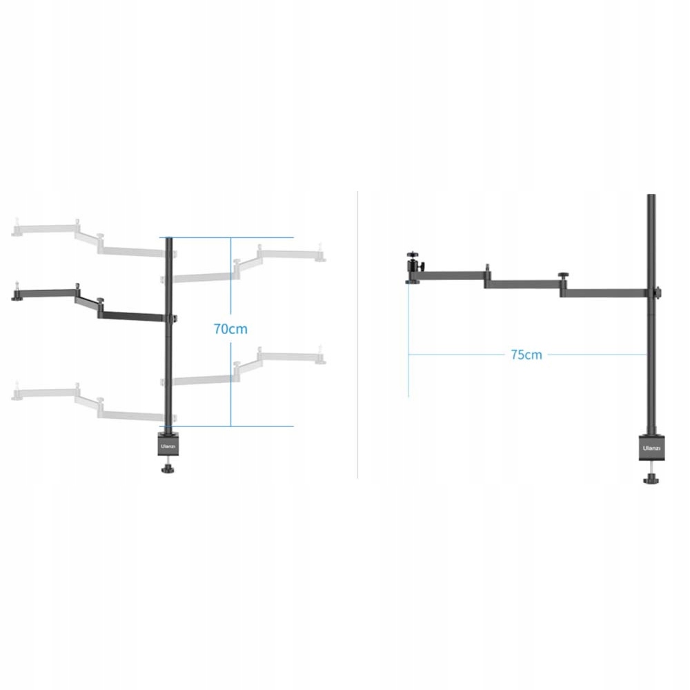 Настольная подставка Ulanzi — регулируемая настольная подставка, предназначенная для обустройства домашней студии звукозаписи или фотосъемки мелких предметов, лежащих на столе. Он также идеально подойдет для съемки кадров, демонстрирующих, например, ручную работу. Комплект состоит из двухсегментной вертикальной колонны общей высотой 70 см, к которой прикреплен горизонтальный , устанавливается >регулируемым плечом. Сама рука состоит из трех сегментов, а ее общая длина составляет 75 см. Сегменты можно свободно вращать и фиксировать в выбранном положении с помощью широких зажимов.
