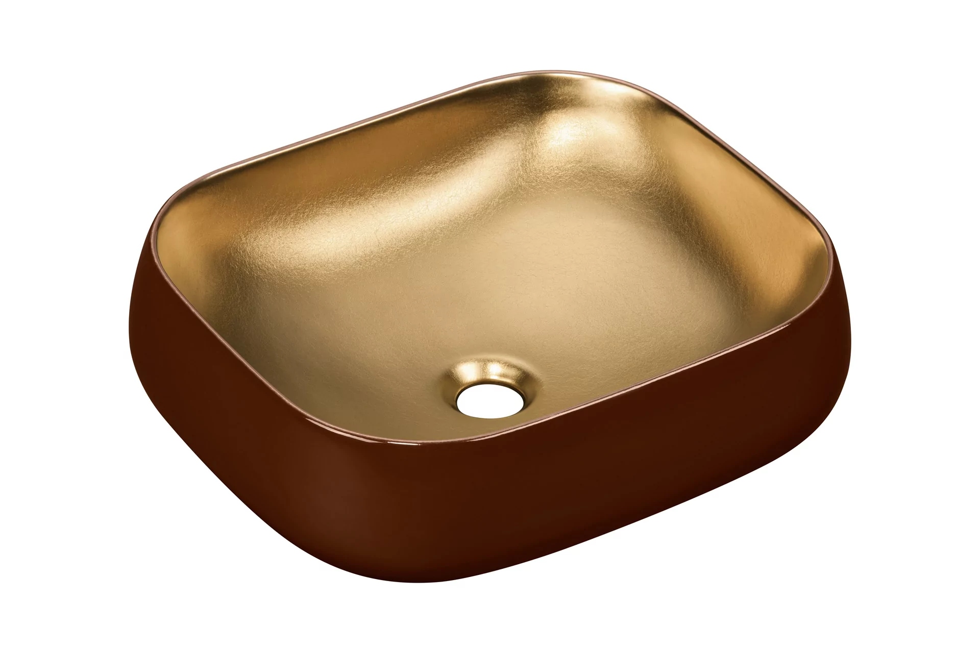 Керамическая раковина Celia TR-T323 – предложение для всех, кто ценит оригинальный дизайн и оригинальность сантехники. Этот умывальник отличается красивым сочетанием цветов – матового золота внутри и бордового снаружи. Квадратная форма умывальника шириной 44,5 см придает ему элегантность и изысканность, а фактура поверхности добавляет еще больше шарма и выделяет это изделие среди других. И все это по очень привлекательной цене.