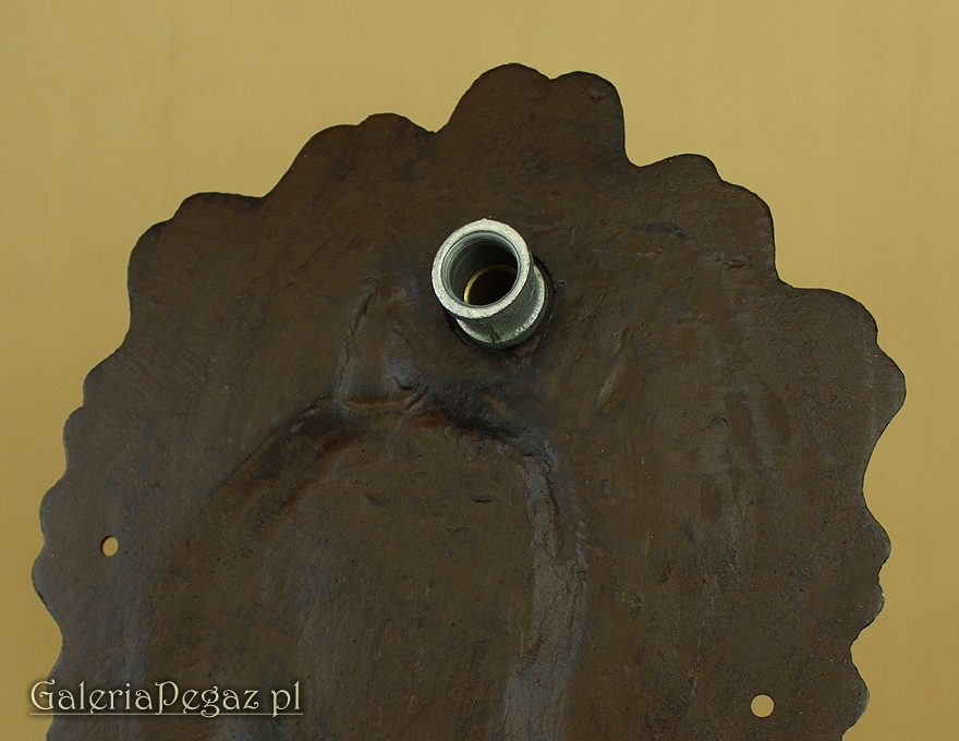 Чугунная, коричневая настенная садовая раковина с потертостями (патина), украшенная головой лошади.