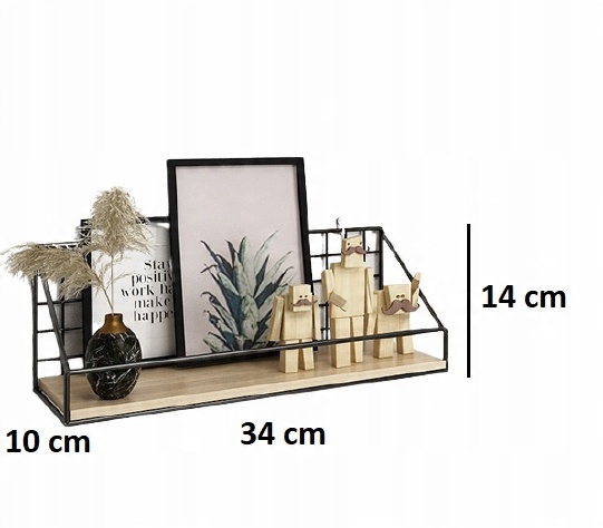 Металлическая полка для подвешивания на стену изготовлена из металла с порошковым покрытием черного цвета. Подставка изготовлена из лакированного светлого дерева, что придает помещению индустриальный стиль.