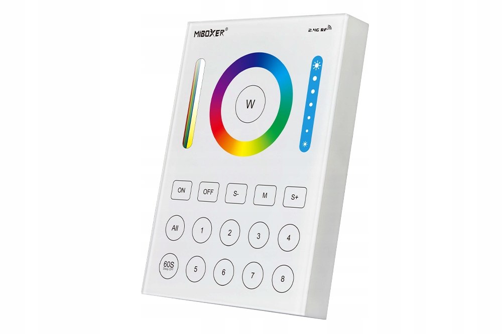 8-зонная настенная панель B8 (RGB + CCT) для контроллеров Bergmen от MiBoxer, использующих технологию беспроводной передачи данных 2.4G RF. Позволяет регулировать яркость, цветовую температуру и насыщенность — 16 миллионов цветов на выбор. Возможность настроить автоматическое выключение света через 60 секунд. Максимальная дистанция управления до 30 м. Питание от аккумулятора 3 В (2 шт. ААА) или от сети от блока питания.