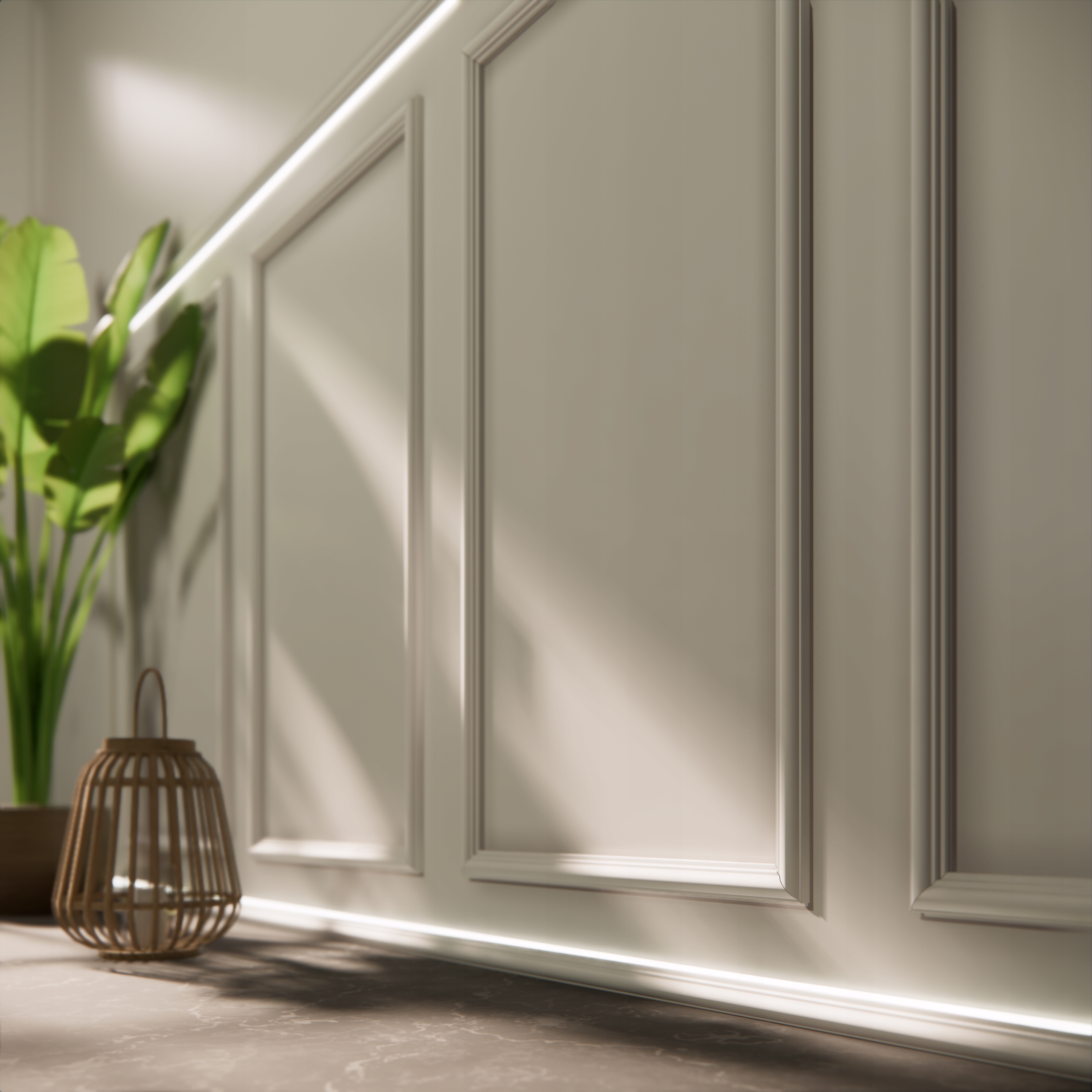 Настенная планка ANGLO – элегантный отделочный элемент, который придаст неповторимый характер помещению. ваши интерьеры. Эта полоса размером 40x16 мм позволяет создавать современные рамы, а также горизонтальные и вертикальные линии, придавая стенам тонкий, но яркий акцент.