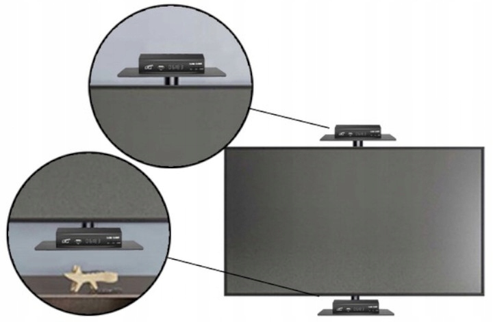 Полку декодера можно закрепить двумя способами: непосредственно на стену или на телевизор. Благодаря двум входящим в комплект крепежным элементам каждый может настроить полку по своему вкусу. Полка имеет грузоподъемность 3 кг, поэтому на нее легко можно разместить DVD-плеер или декодер.