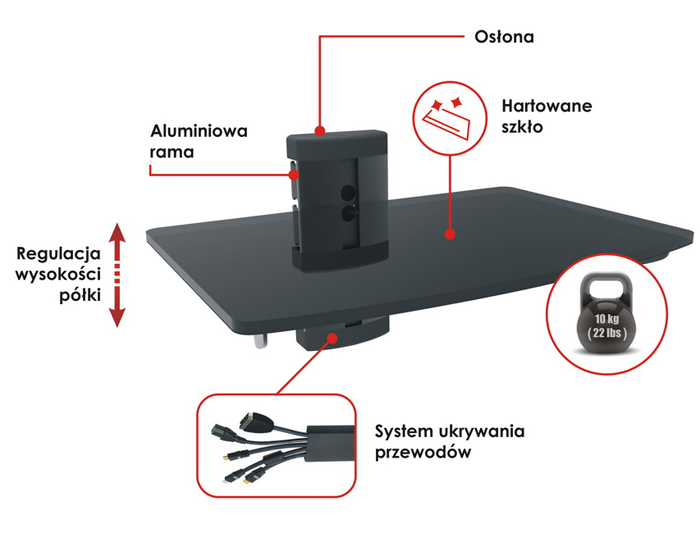 Полка изготовлена из стали, алюминиевых деталей, эстетичного пластика и закаленного стекла.
