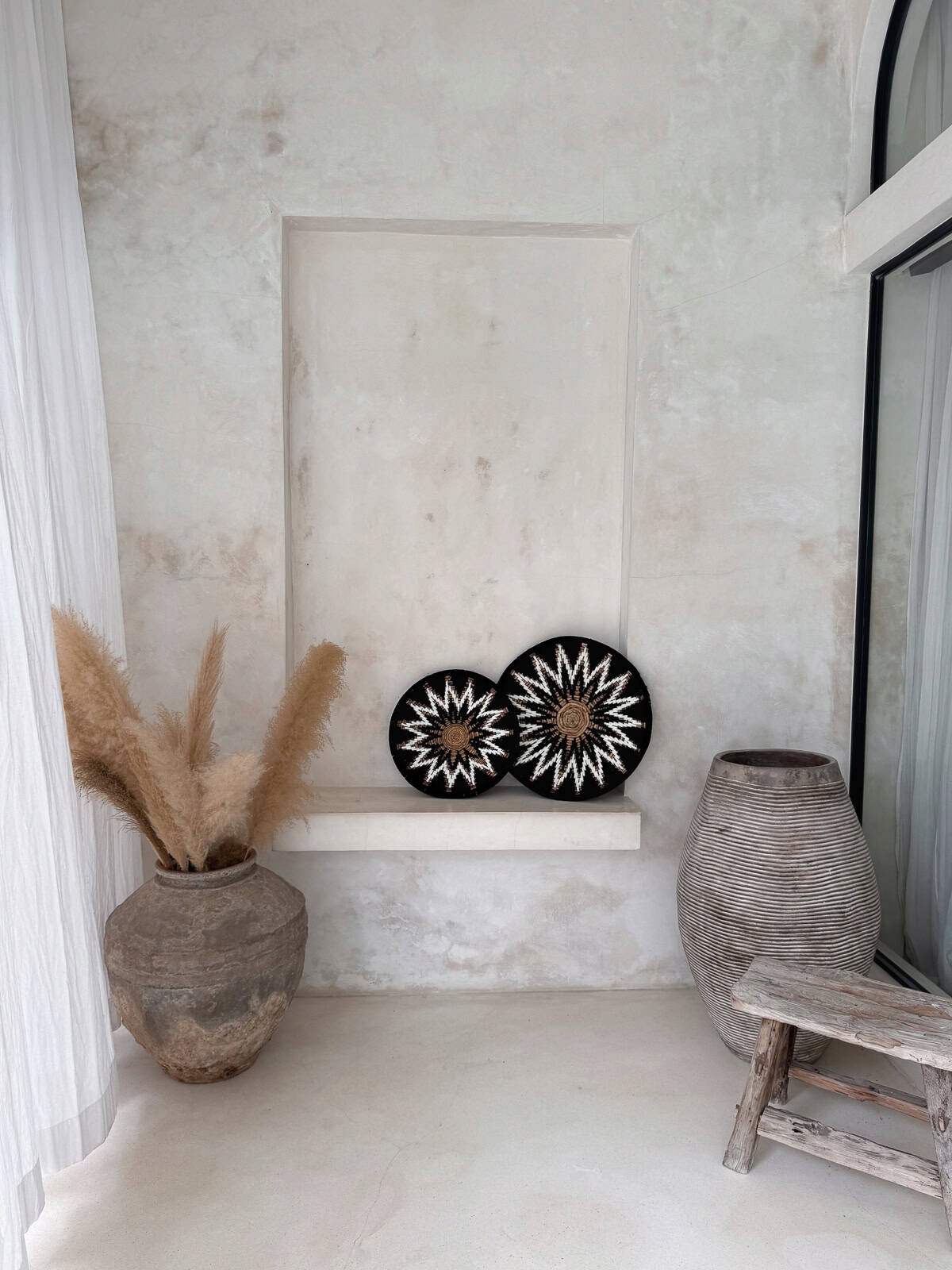 Округлая форма и темные цвета создают сильный контраст, который прекрасно гармонирует со светлыми стенами, необработанным деревом и растительностью. Это украшение в стиле бохо из Бали будет хорошо смотреться как самостоятельная композиция или как элемент более крупной настенной композиции.