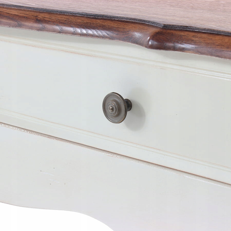 Верх предлагаемой нами консоли имеет прямоугольную форму. Под столешницей расположены два ящика с декоративными ручками.