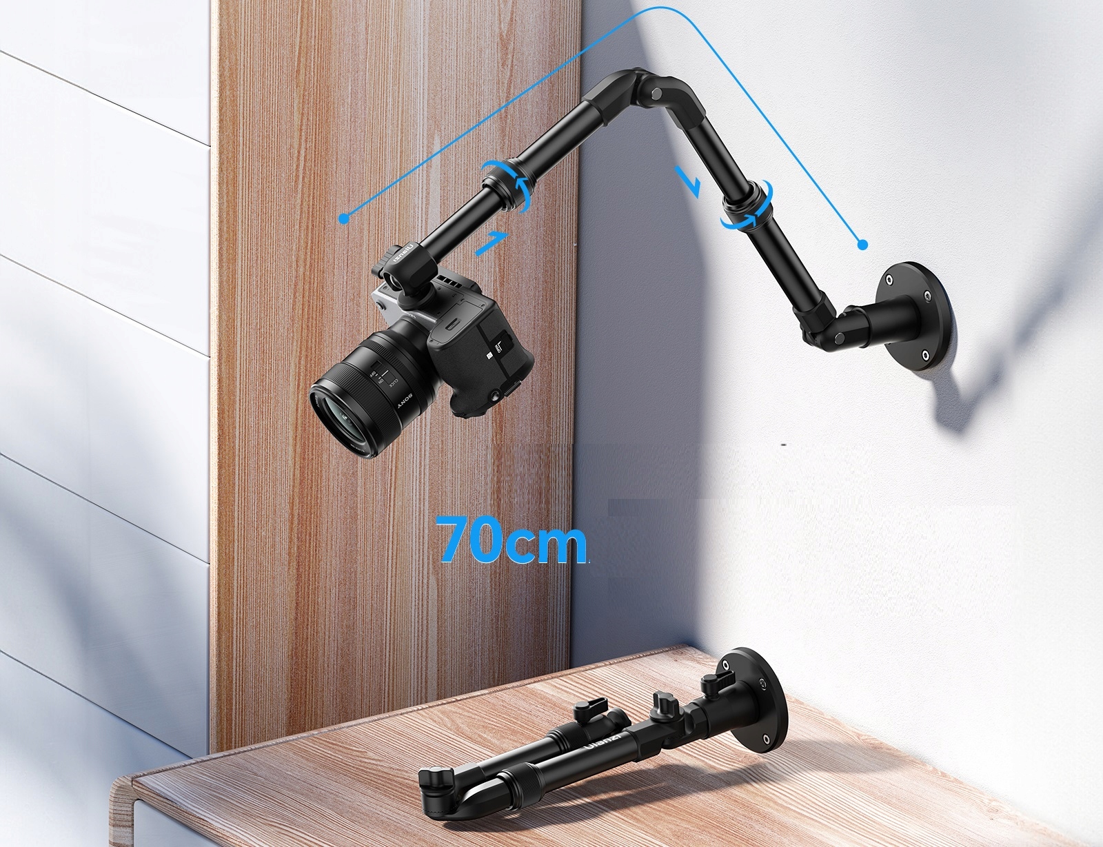 ⭐wysięgnik mocowany jest na stałe do ciany za pomocą kołków rozporowych i śrób. Складная структура состоит из двух сегментов, которые могут быть повернуты в диапазоне 360 ° и наклонены вперед / назад в диапазоне 180 °. Вы можете прикрепить камеру, камеру, держатель телефона, светодиодную лампу, монитор, микрофон и любое другое фото/видео оборудование с 1/4 "креплением с 1/4" /Горизонтально, выше/нижний, дальше/ближе. Из вида птичьего глаза)/горизонтально