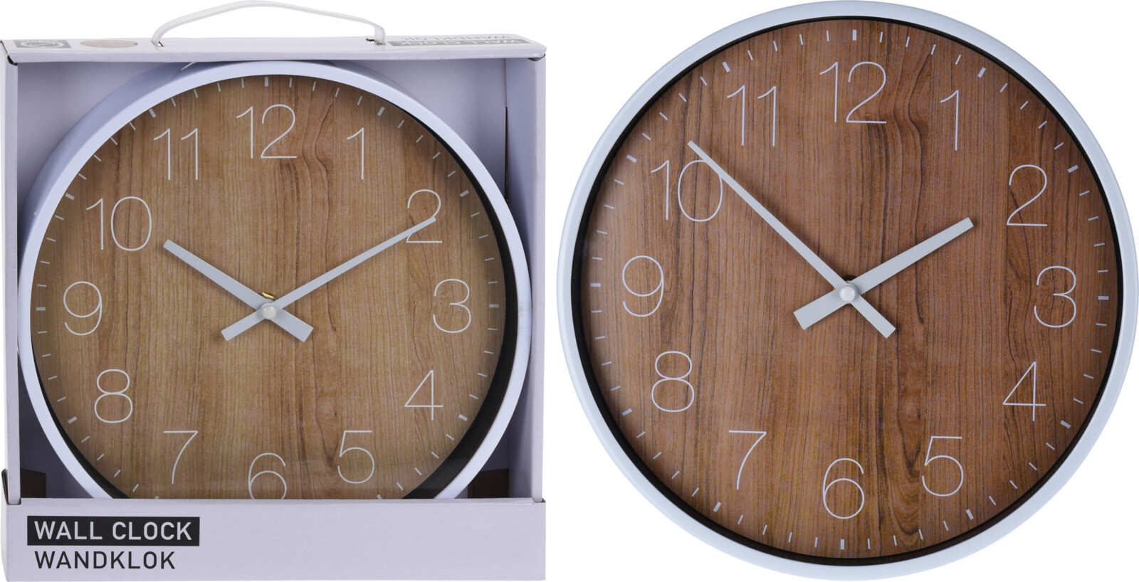 - Декоративные настенные часы с пластиковым экраном с имитационным деревом и белой рамой