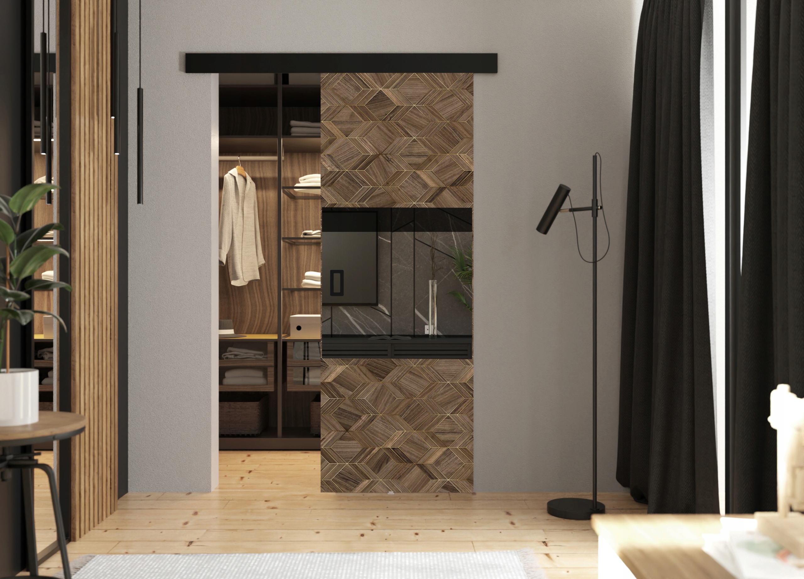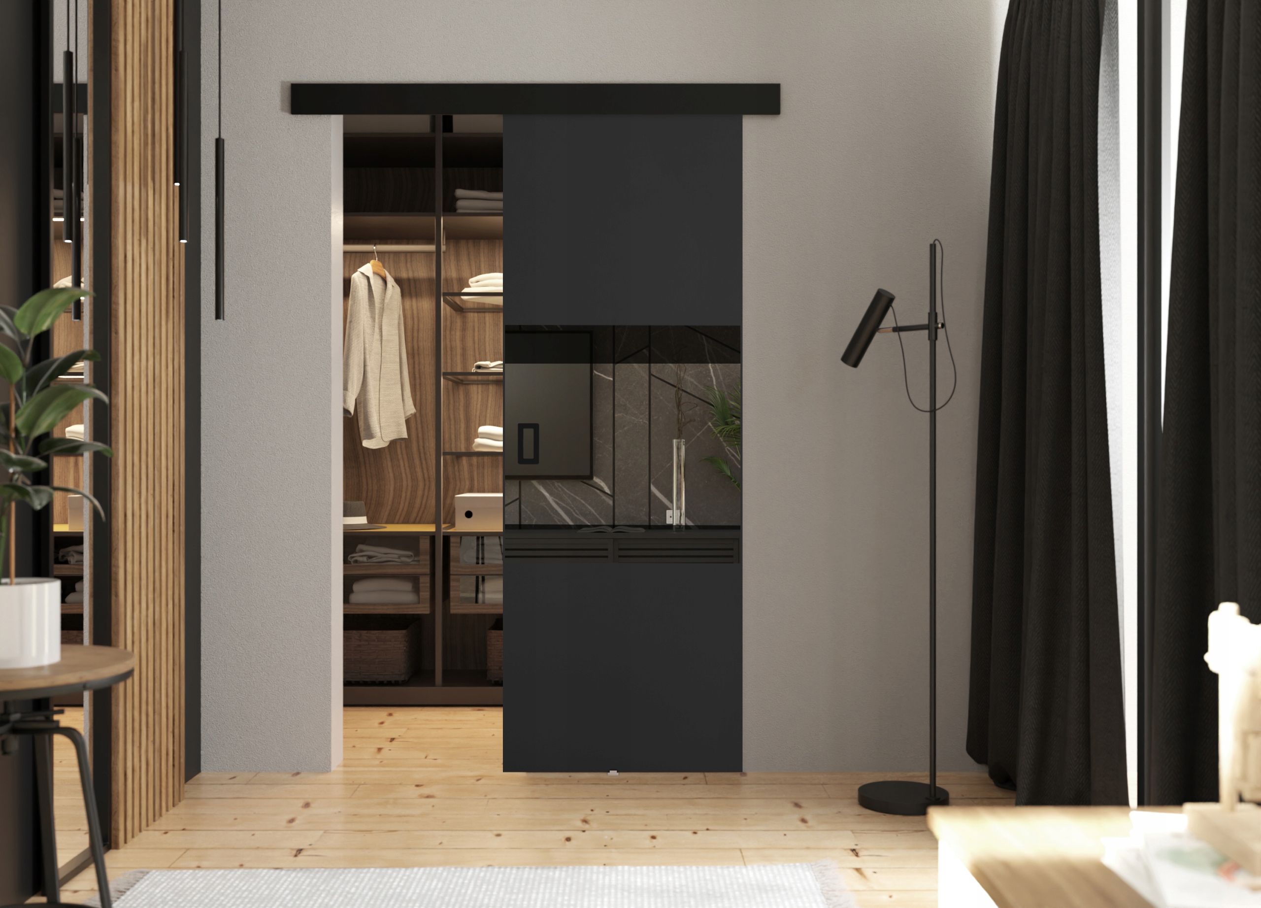Раздвижные двери наверняка оценят люди, которые хотят, чтобы их квартира была просторной и современной. Зеркало и декоративное черное стекло, расположенное на поверхности дверей, делают их идеальным решением для современных квартир.