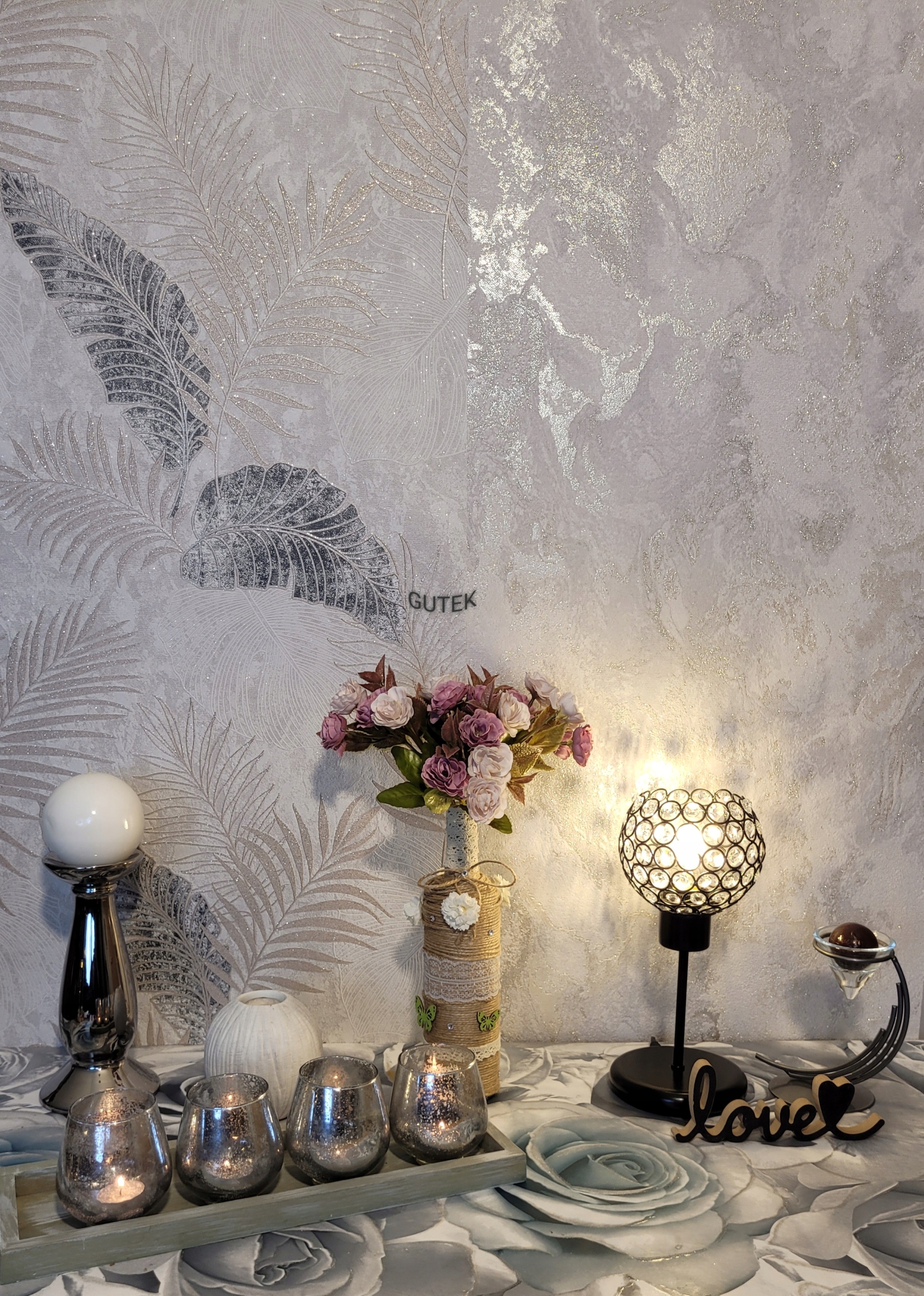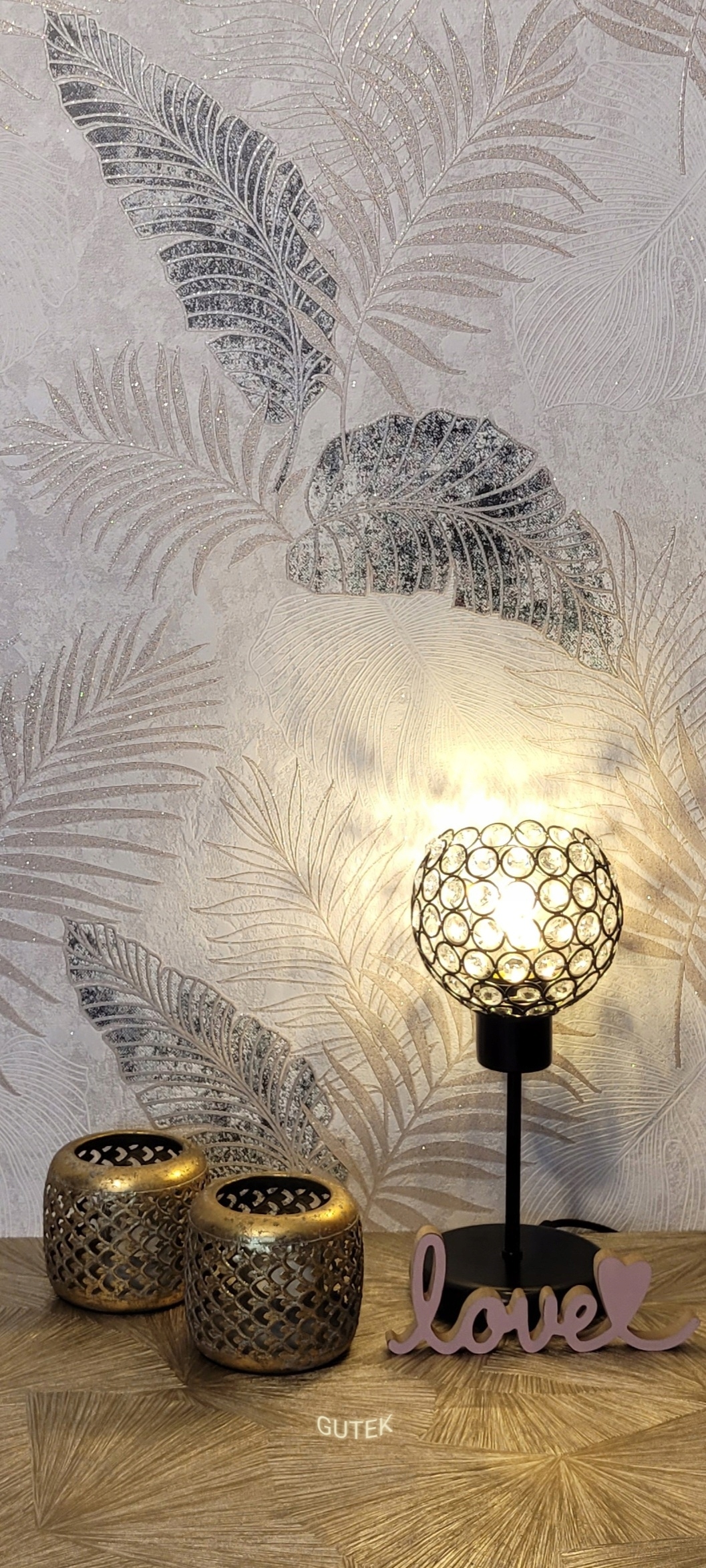 - Элегантные обои, изображающие большие листья с нежным блеском блеска в оттенке бежевого, коричневого, золотого, черного, белого и сливок