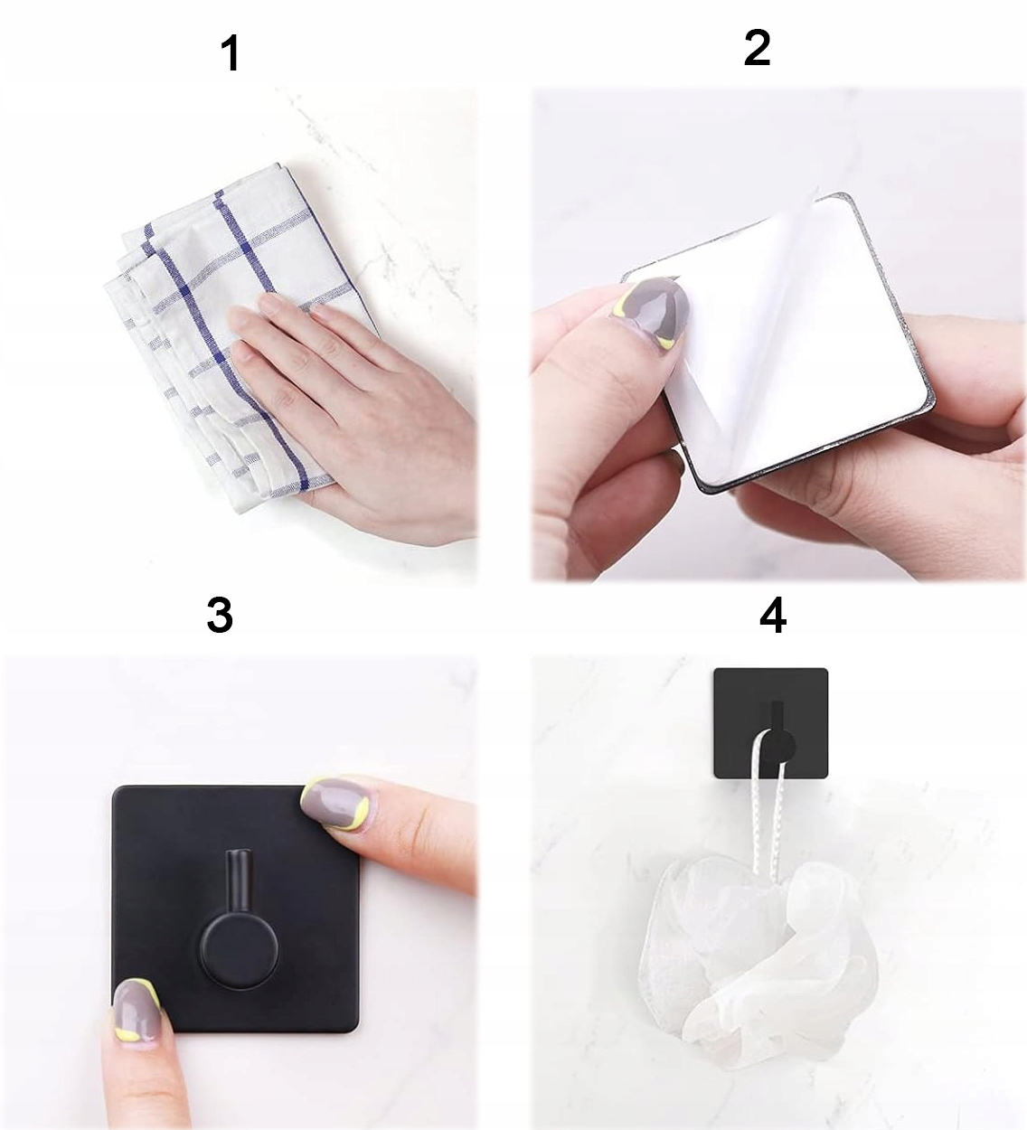 Набор из четырех самоклеящихся крючков черного цвета. Минималистичный дизайн в стиле лофт. Они идеально подходят для кухни, ванной комнаты, прихожей или коридора. Изготовлен из металла и очень прочный. Благодаря использованию прочной самоклеящейся ленты установка не требует вмешательства. Нет необходимости сверлить отверстия в плитке или стене. Просто приклейте вешалку с помощью очень прочного скотча, который идет в комплекте.