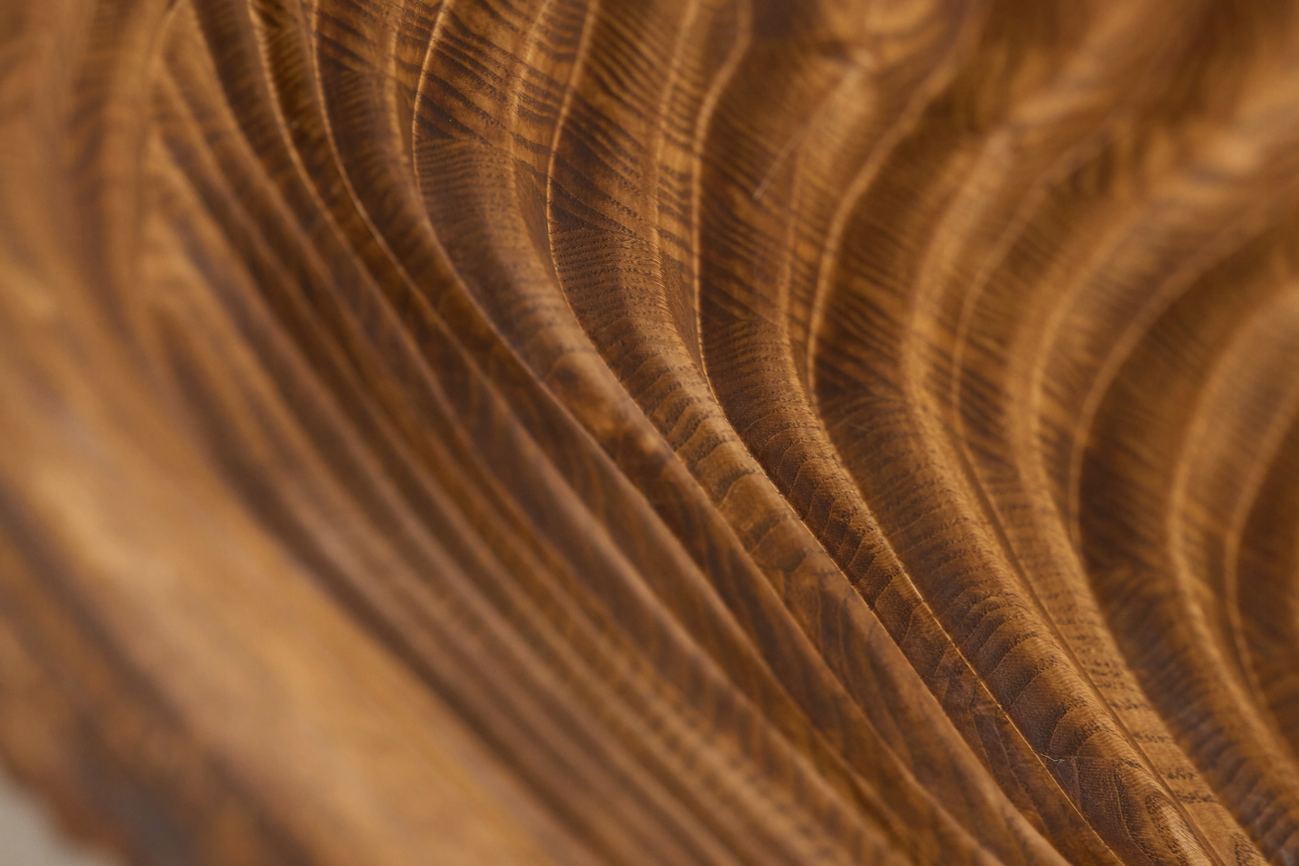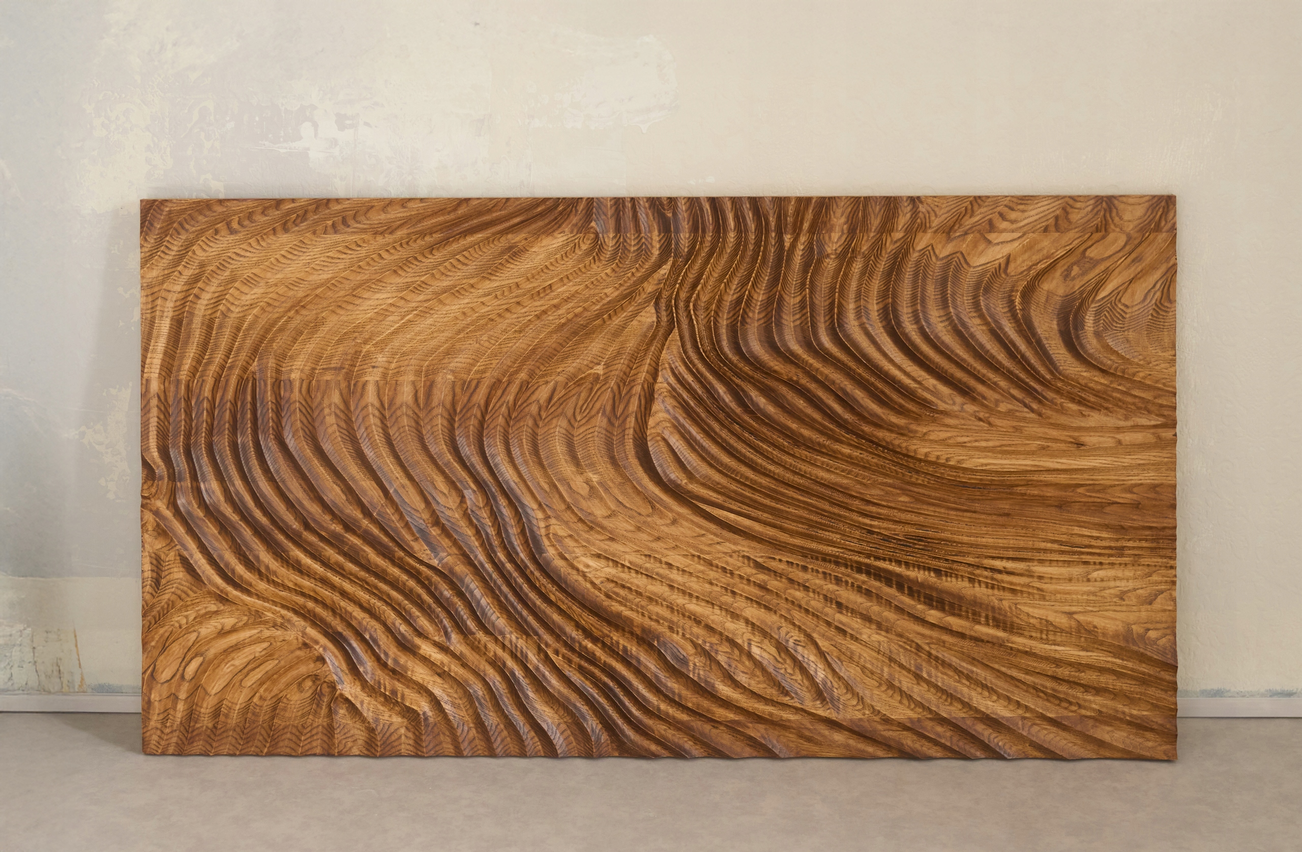 Предлагаем современный настенный рельеф из натурального дерева, с фрезерованной структурой, создающей эффект волн и глубины. Поверхность была тщательно обработана, что подчеркивает естественную красоту текстуры и подчеркивает трехмерный характер рисунка.