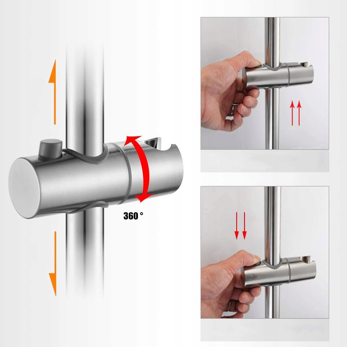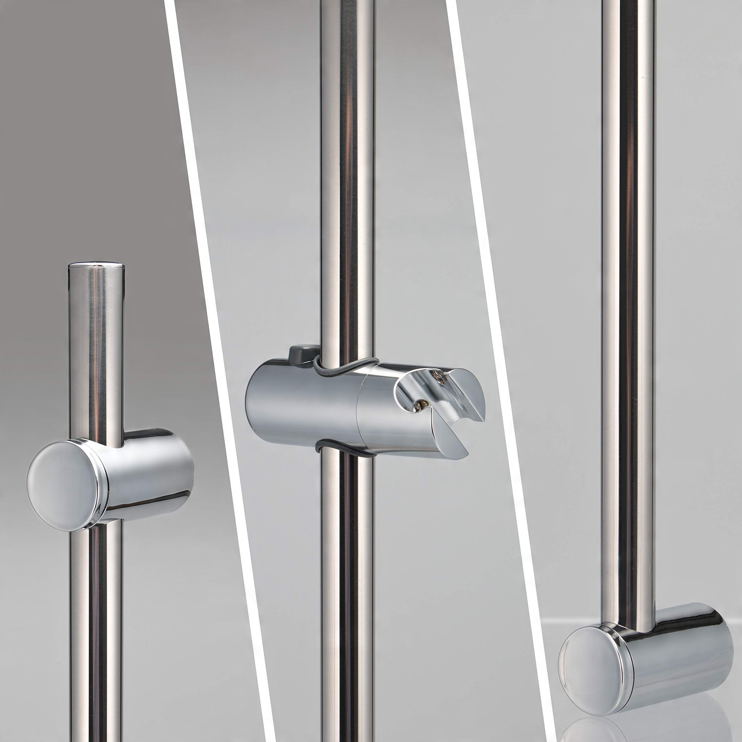 Принятие душевого штанги происходит быстро и легко. Используя имеющиеся отверстия, поместите нижний настенный кронштейн на нижнее отверстие и просто вставьте верхний настенный кронштейн в старое верхнее отверстие. Это экономит ванную комнату и плитку, а также снижает усилия!