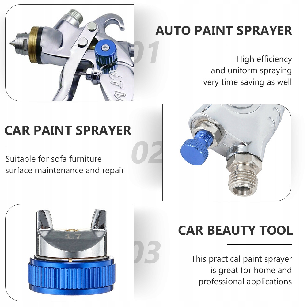 Professional Car Pistol изготовлен из алюминия и pvc . Возможности в различных сопелях, подходящие для многих применений, таких как покраска автомобилей, мебель, стены и другие поверхности